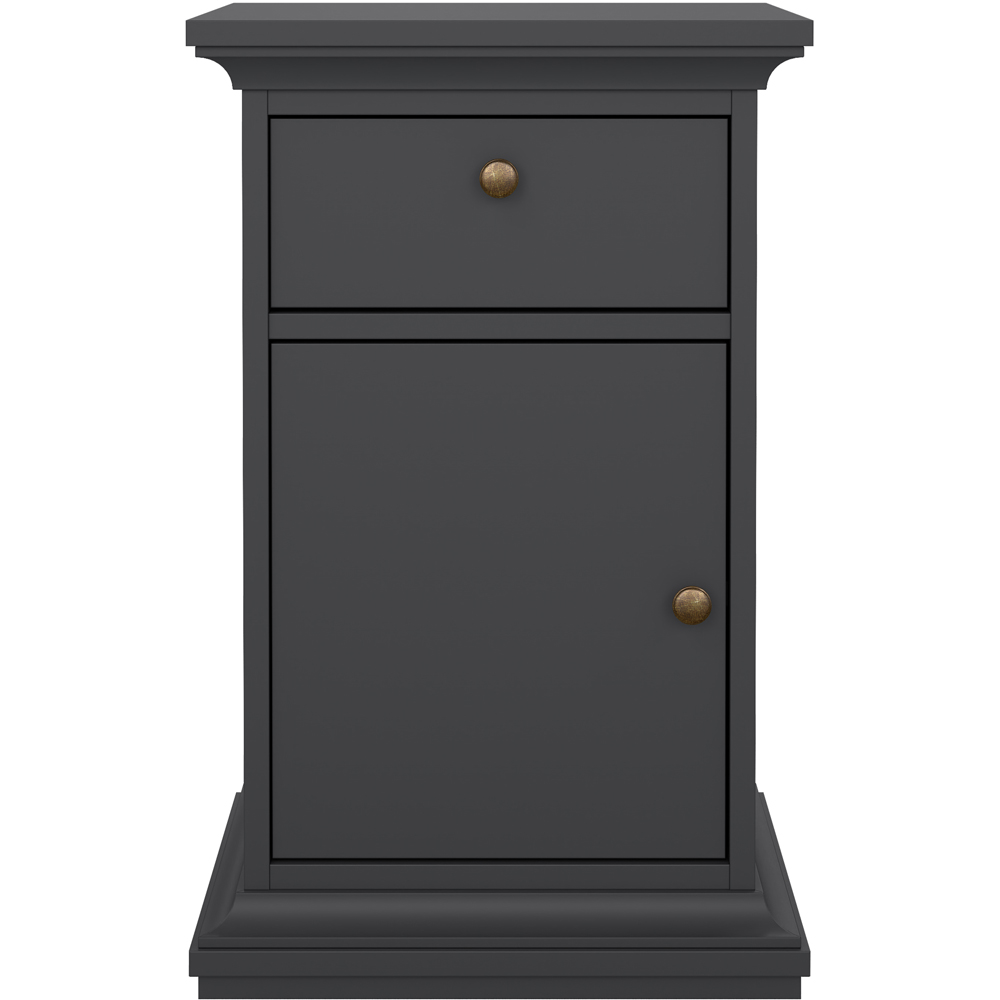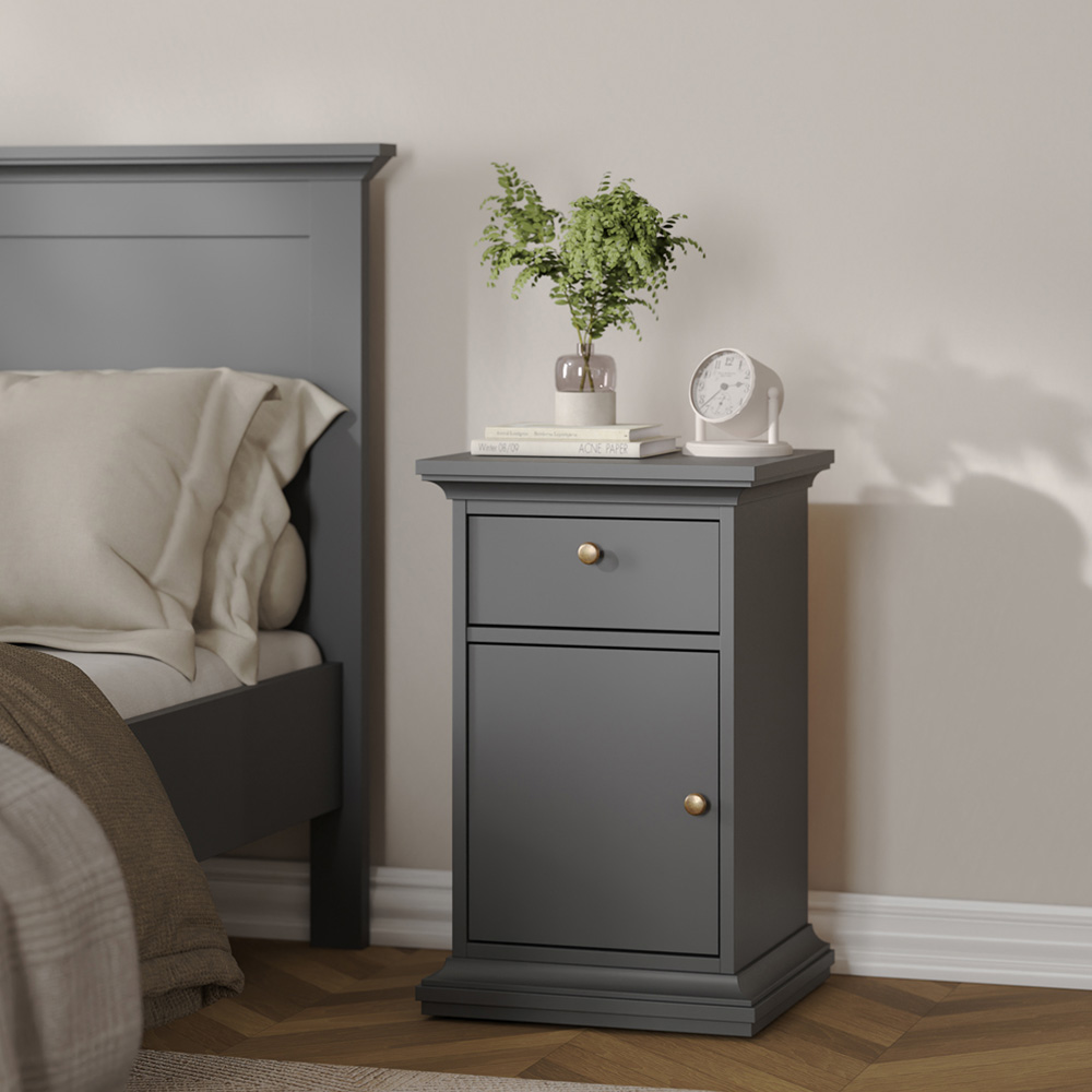 Elevate your bedside experience with the Florence Paris Single Door Single Drawer Nightstand. Finished in matt grey, this Paris nightstand lives up to its name with its romantic style, sophisticated look and beautiful classic feel. A perfect way to enhance your space, the nightstand is bold and offers plenty of storage options, with charm eluding from every angle. Also, both functional and stylish, this unit comes in a fade-resistant and easy-to-clean finish for added convenience. Plus, the high-quality laminated board is resistant to damage and scratches, moisture and high temperature. Weight capacity: Top: 17kg, Shelf: 11kg and Drawer: 2kg.