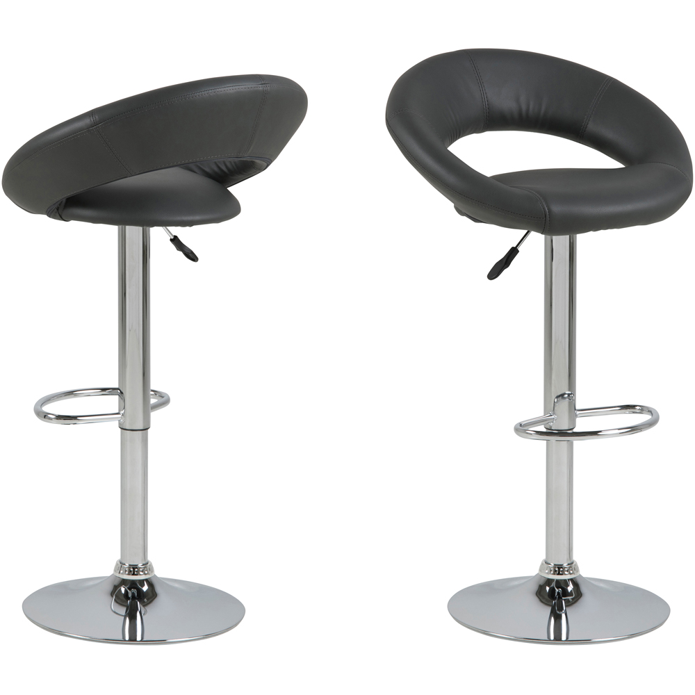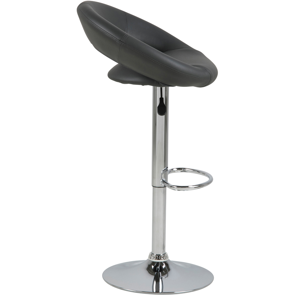 This bar stool is a stylish addition to any bar or kitchen counter. Upholstered in black modern polymer supported by a trumpet base chrome steel, it offers both comfort and durability. With gas lift and swivel features, this stool provides flexibility and ease of use for your seating needs.