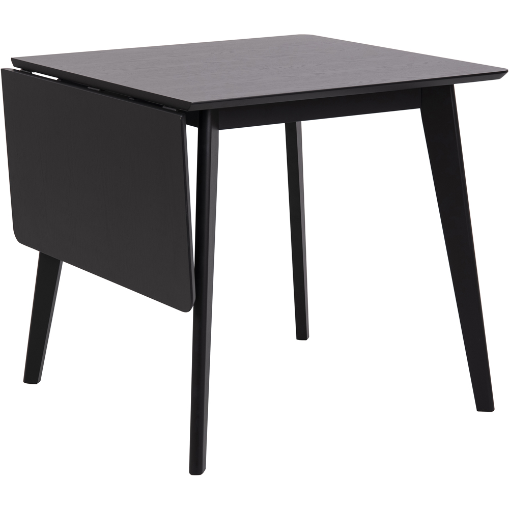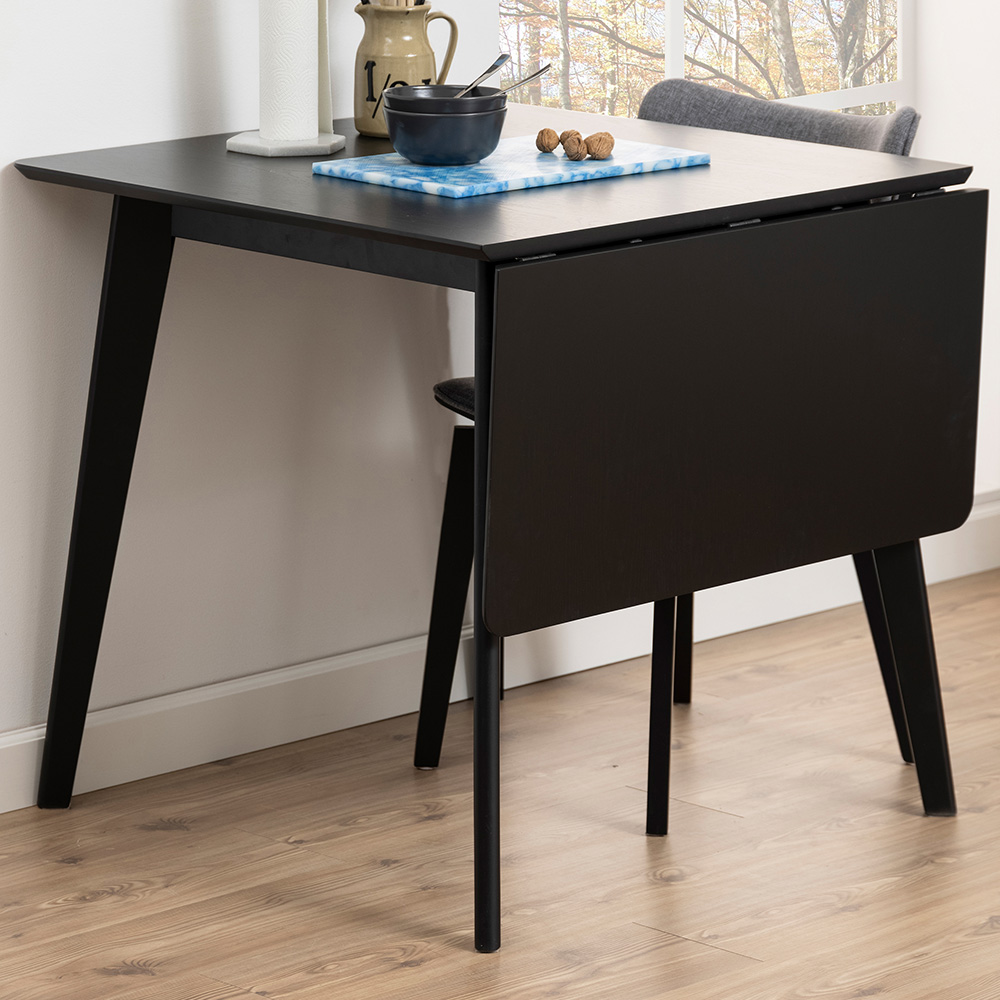 Our square dining table is a versatile addition to any home, featuring a matt black lacquered oak veneer top and a matching base. Designed with practicality in mind, it includes extension leaf storage, making it ideal for both small and large gatherings.