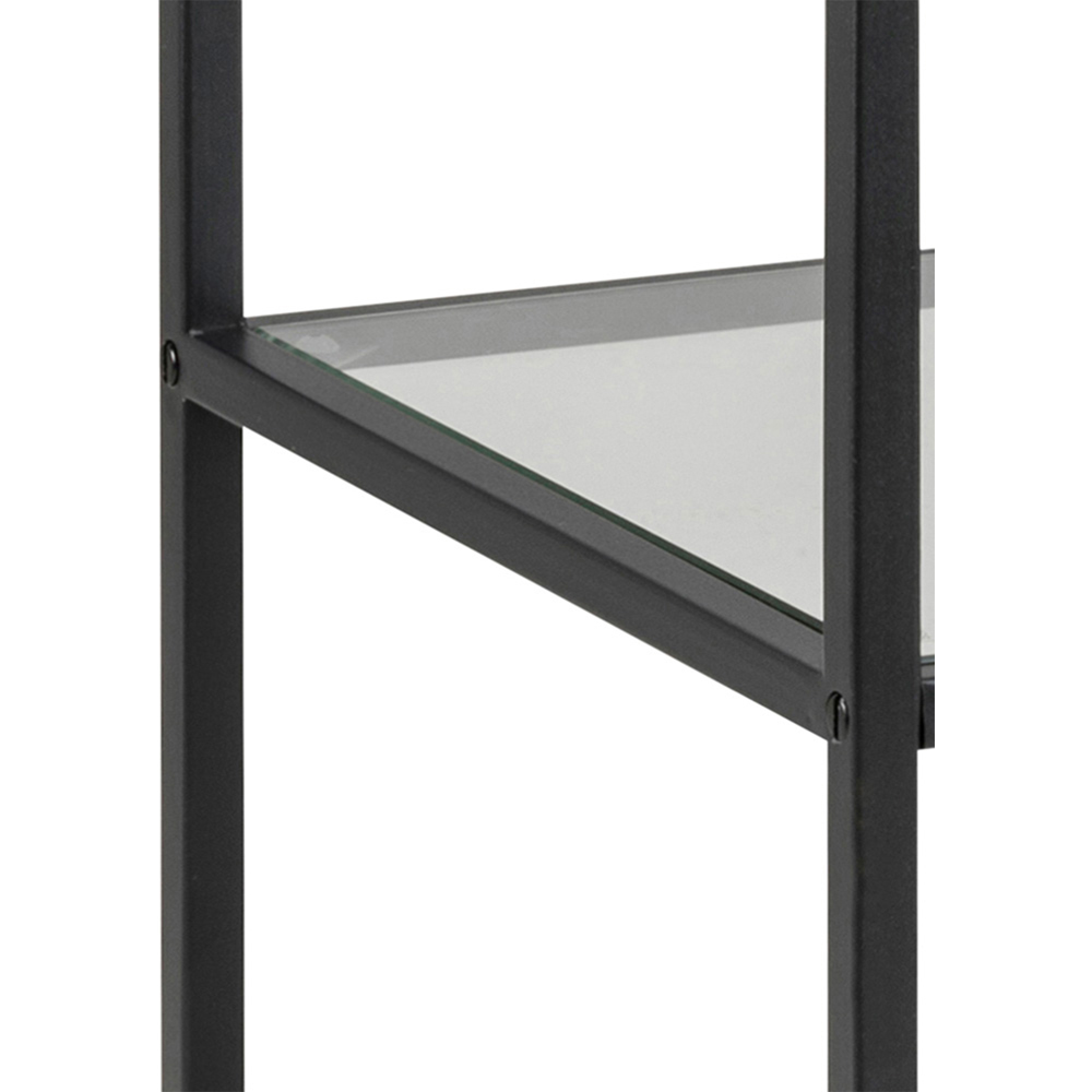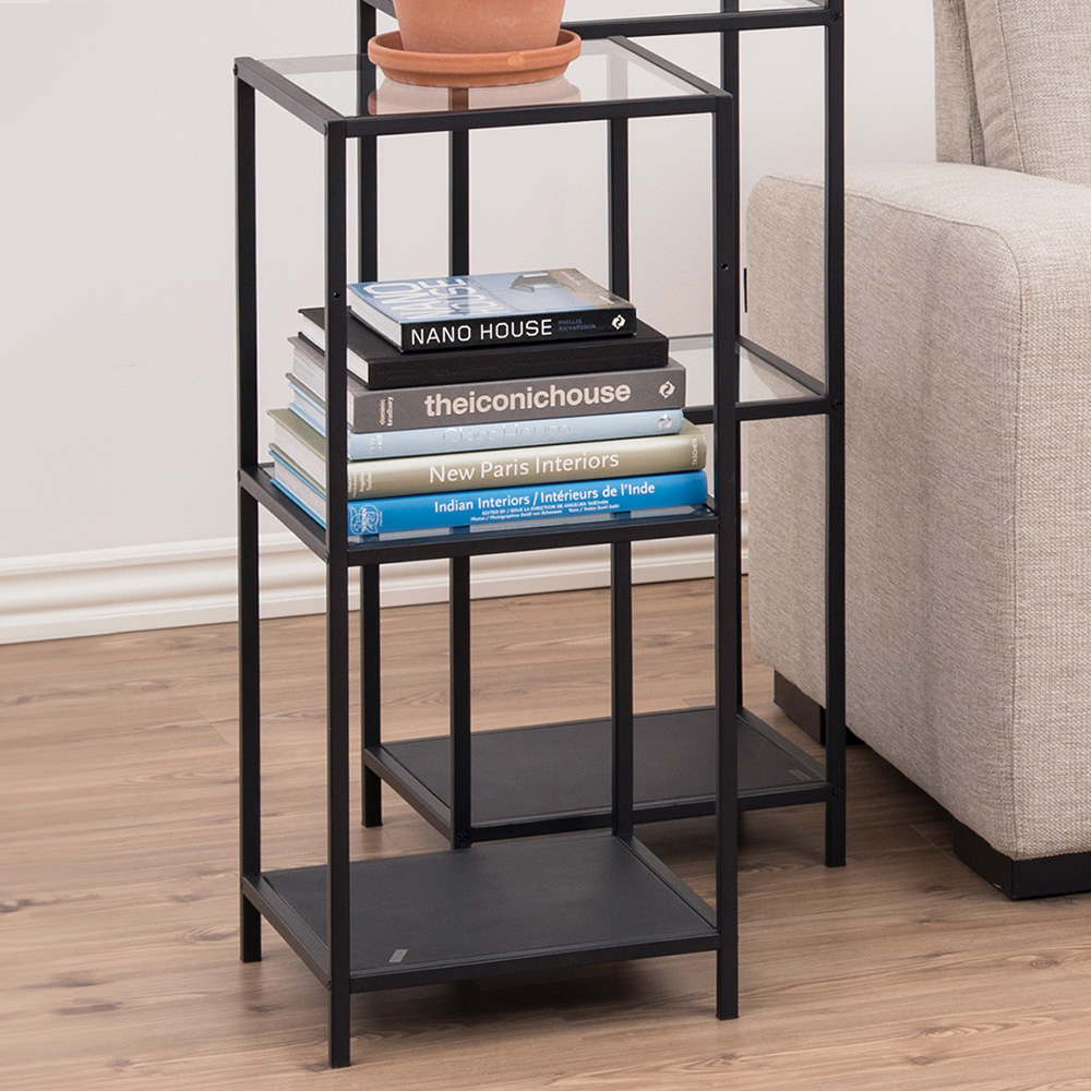 Introduce a modern touch to your space with this sleek bookcase, featuring a matte black steel frame and base. It's designed with two shelves made of clear and frosted black tempered glass, perfect for a contemporary display and storage solution.