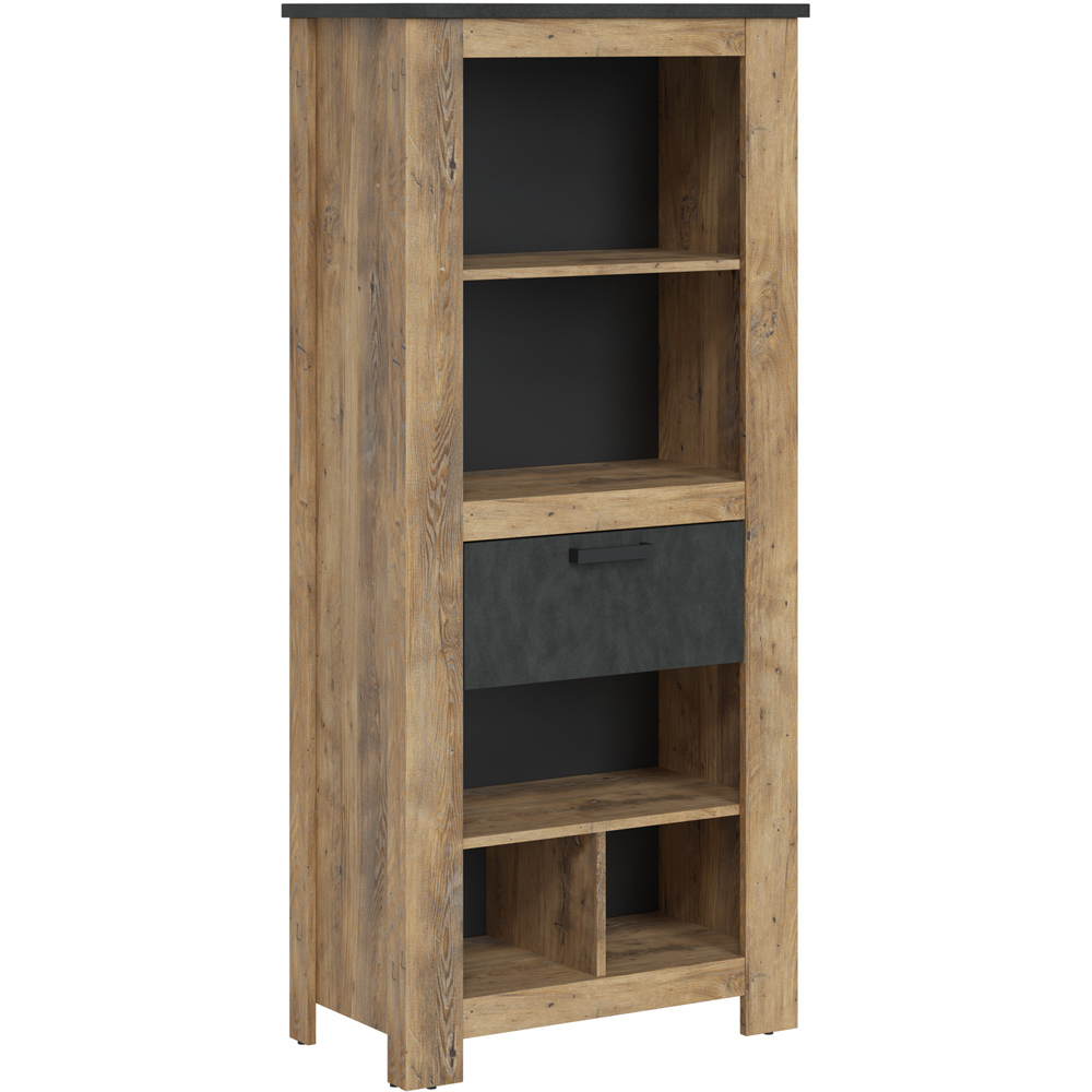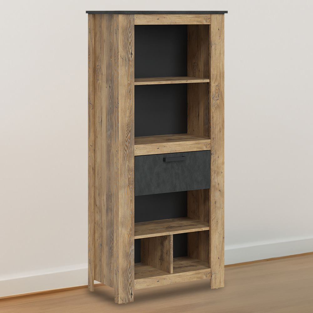 Upgrade your living room with style with this Florence Single Drawer 5 Shelf Chestnut and Matera Grey Bookcase. This is rustic yet modern, finished with old-style wooden fronts and a matera grey top and handles. You can mix and match pieces to create a truly stunning interior and create the perfect setting within your home. Made from high-quality laminated board resistant to damage, scratches, moisture and high temperature.