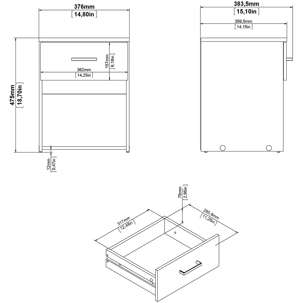 Make good use of your space - the clues in the name! The Space collection of bedroom furniture is highly practical and ideal for creating useful storage while taking up a minimal footprint in your room. This package includes a 1 drawer bedside. 3-drawer chest of drawers and a 2-door wardrobe. Bedside: W 37.6 x H 47.5 x D 35.95 cm. Chest: W 74.1 x H 69.9 x D 35.95 cm. Wardrobe: W 77.6 x H 175.4 D 49.45 cm.