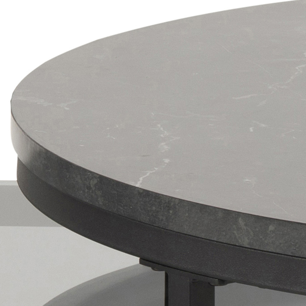 Enhance your living area with this sophisticated set of two coffee tables, each featuring a chic black marble effect top paired with smoked tempered glass. The matte black steel base adds a touch of elegance, making them a perfect match for any modern decor.