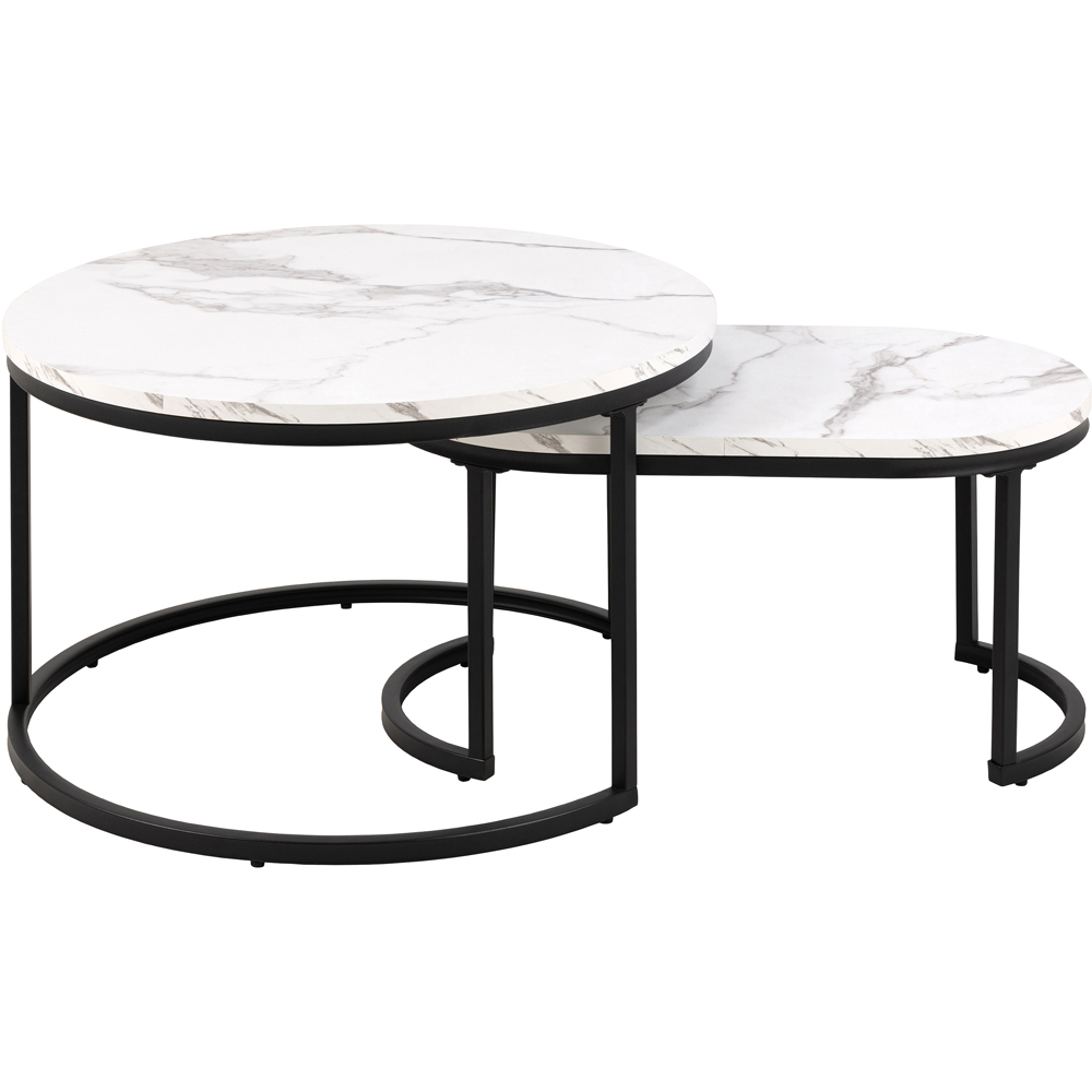 Introduce a touch of sophistication to your living area with this set of two Spiro coffee tables, each featuring a white marble Granada top and a matte black steel base. Their round and oval shapes offer versatile elegance without overwhelming your space.