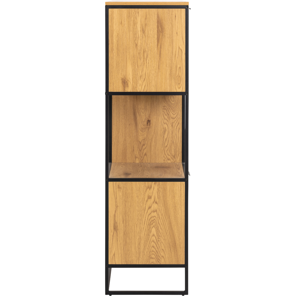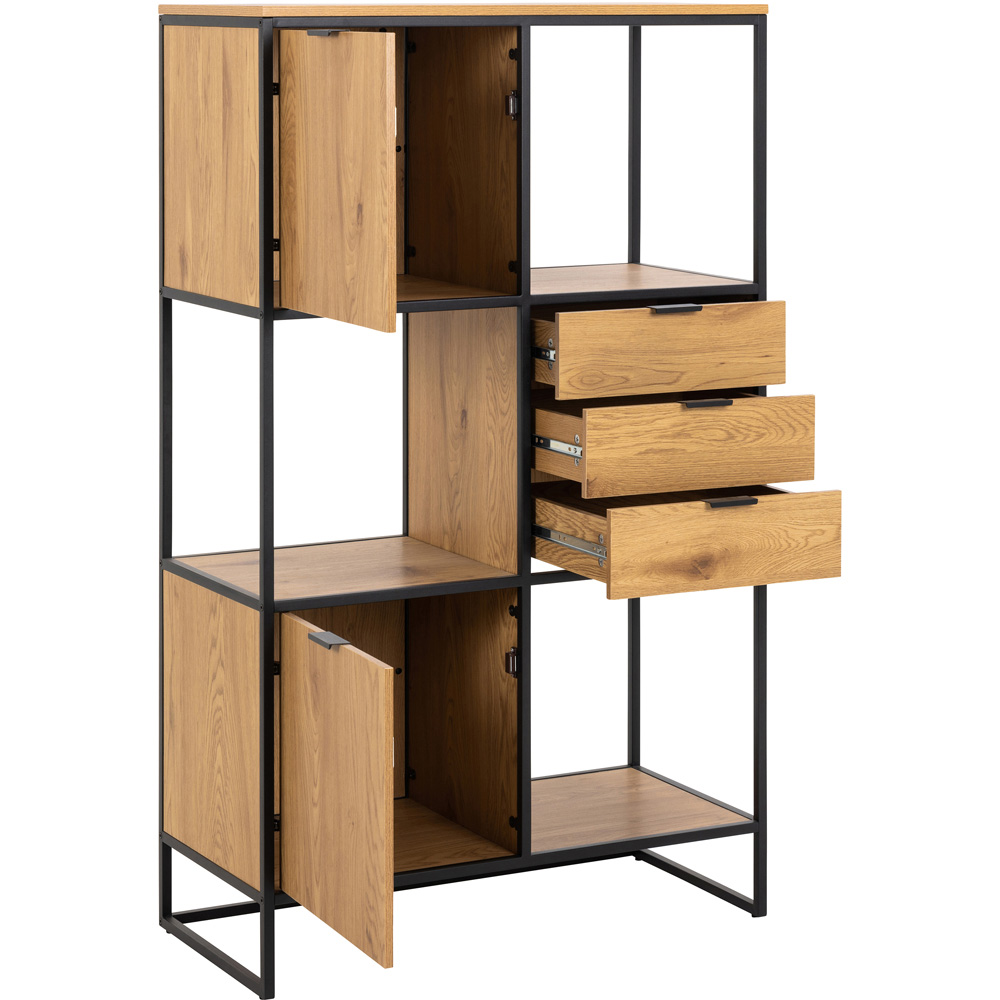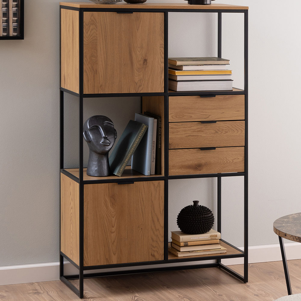 Enhance your space with our contemporary bookcase, featuring a matte black steel frame and base. It offers a blend of style and utility with its wild oak-effect shelves, asymmetrical design, and ample storage including two doors, three drawers, and an open compartment for all your organisational needs.