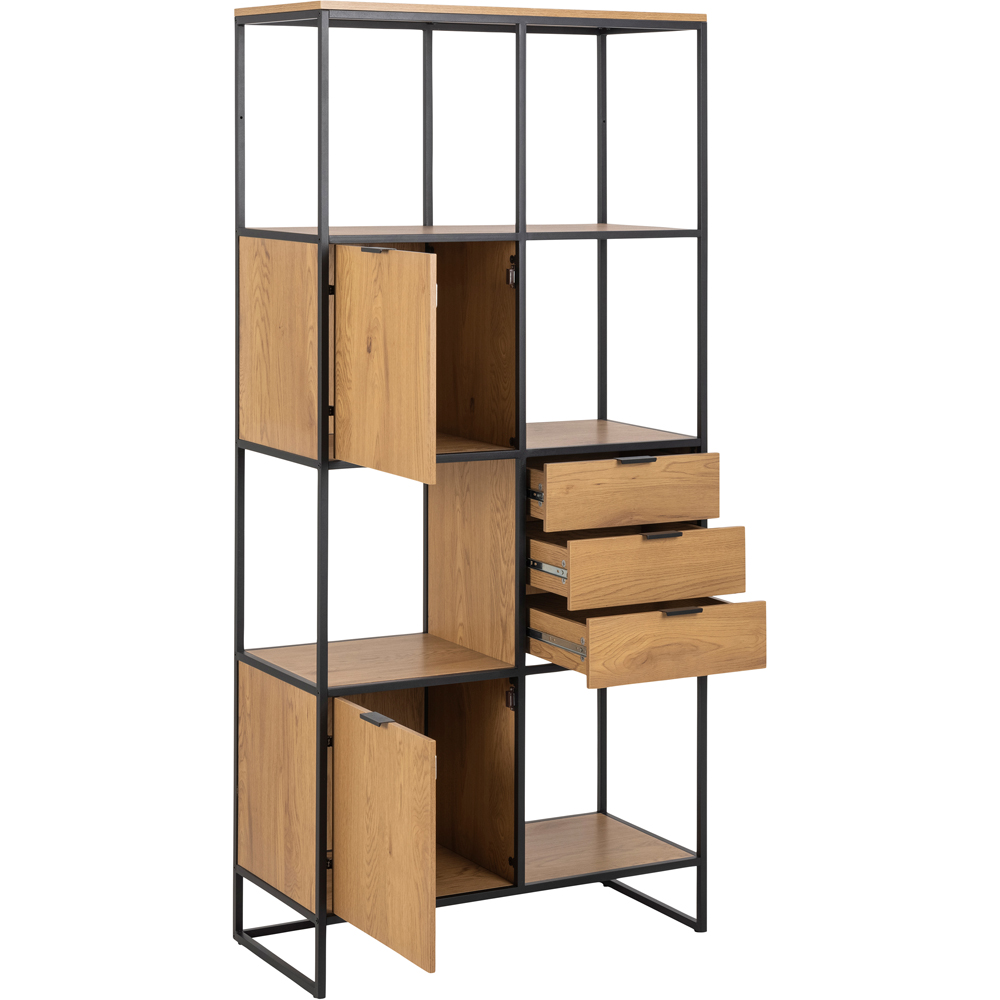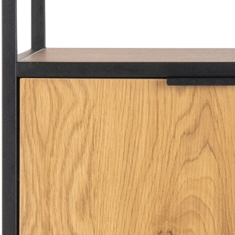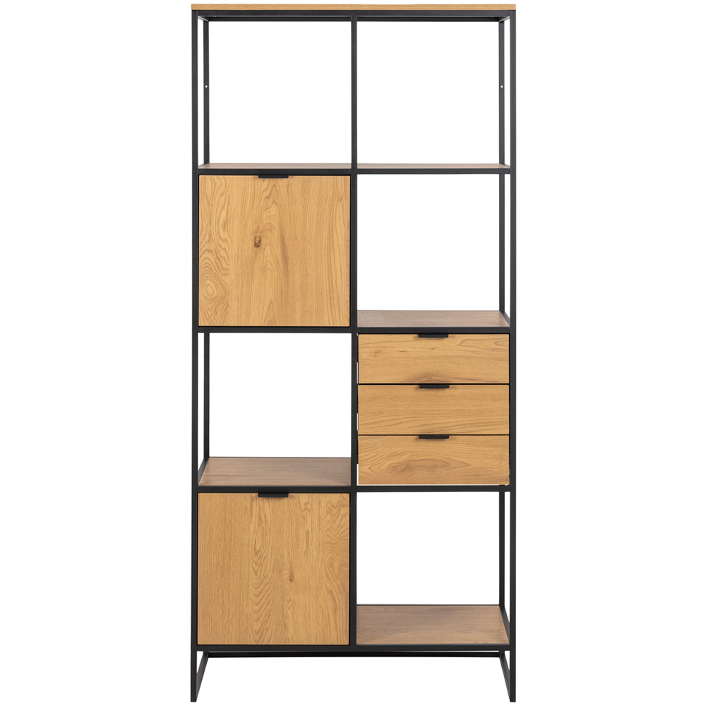 Reimagine your space with our stylish bookcase, a harmonious blend of matte black steel and a textured wild oak effect. Its asymmetrical design, complete with two doors, three drawers, and two shelves, offers a unique and practical solution for your storage and display needs.