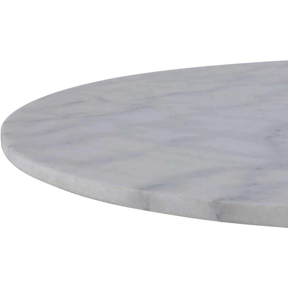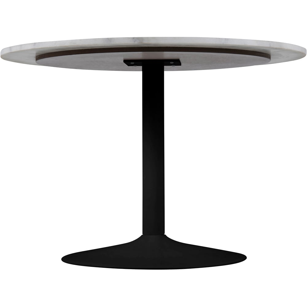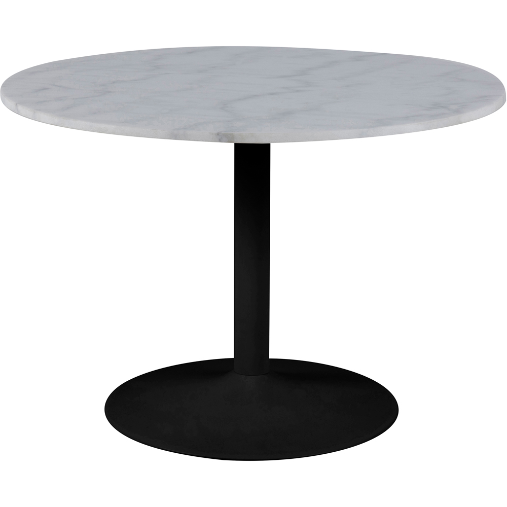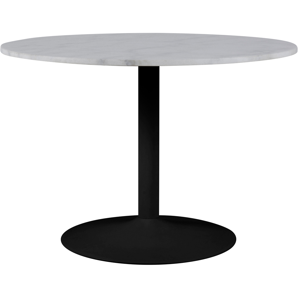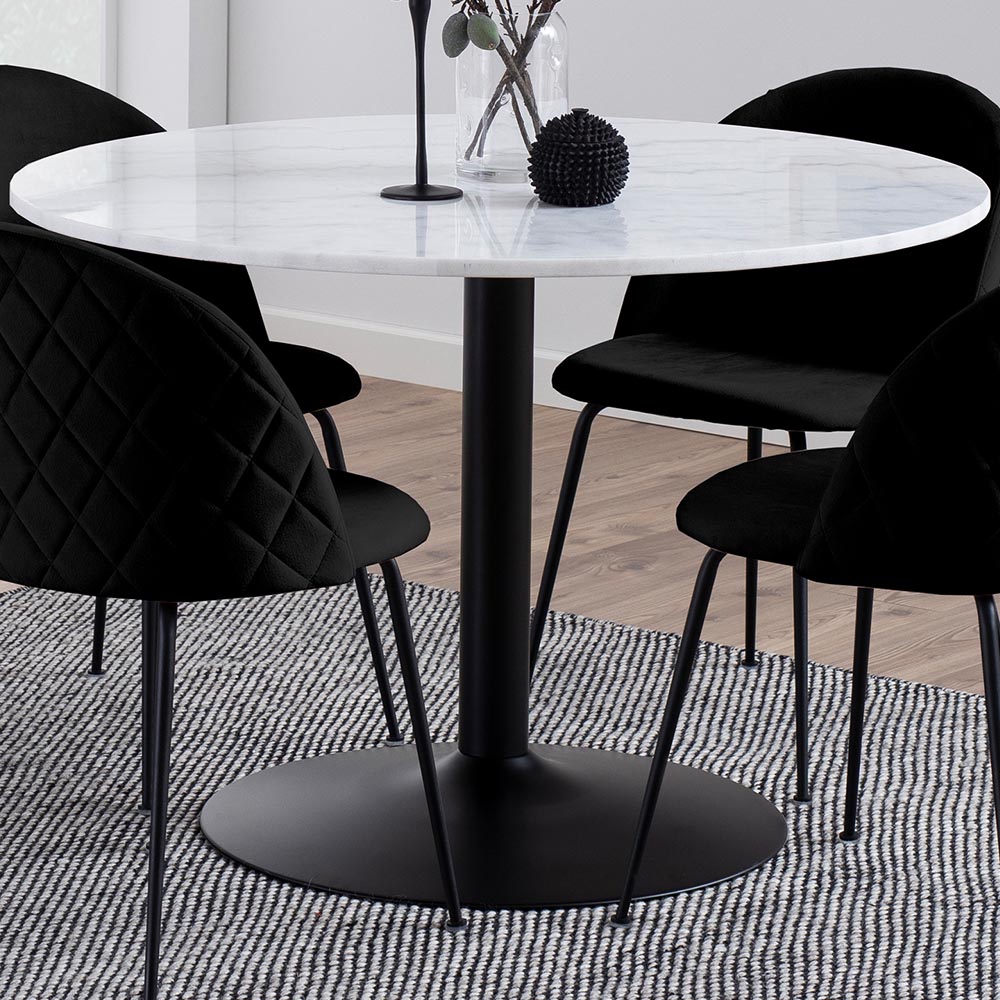Experience the elegance of our round dining table, featuring a pristine white marble top and a striking matte black trumpet base. Its circular design invites conversation, making it an ideal centrepiece for intimate gatherings.