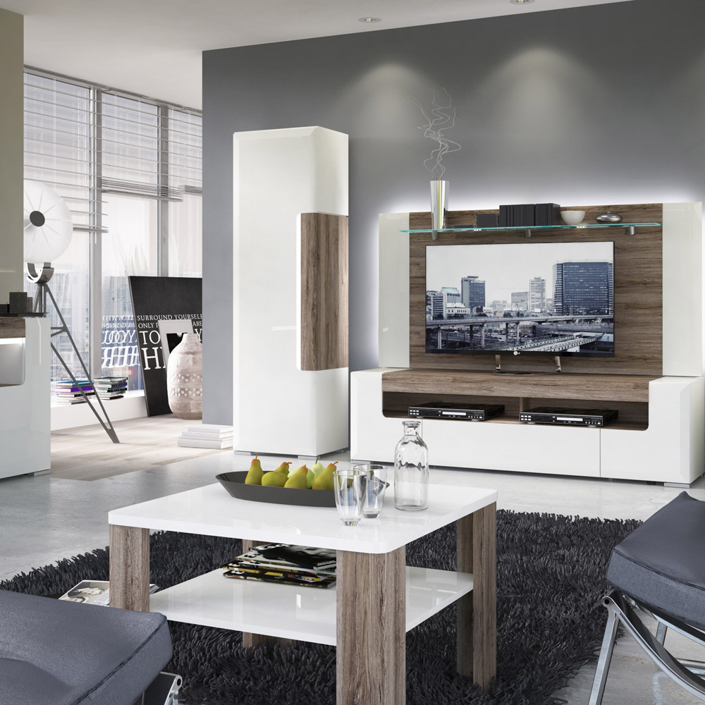 Coffee Table with shelf. Nice modern-designed coffee table with a handy shelf for magazines etc. Warm and yet cool living and dining collection in white with San Remo Oak inset.