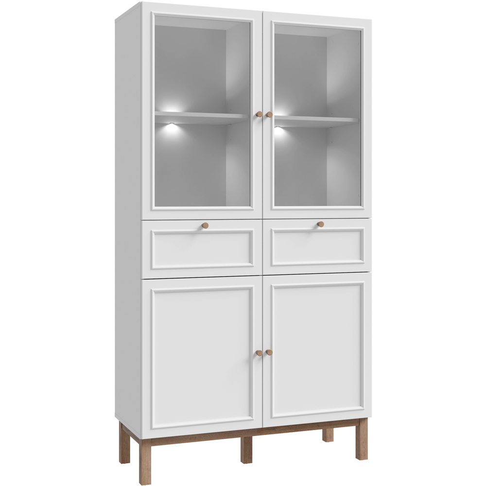 Showcase your collection with the Wensley Display Cabinet in Light Grey and Oak. This modern design features safety toughened glass, LED lighting, and a soft-closing system. LED lighting is included, and the furniture is fitted with transparent safety toughened glass.