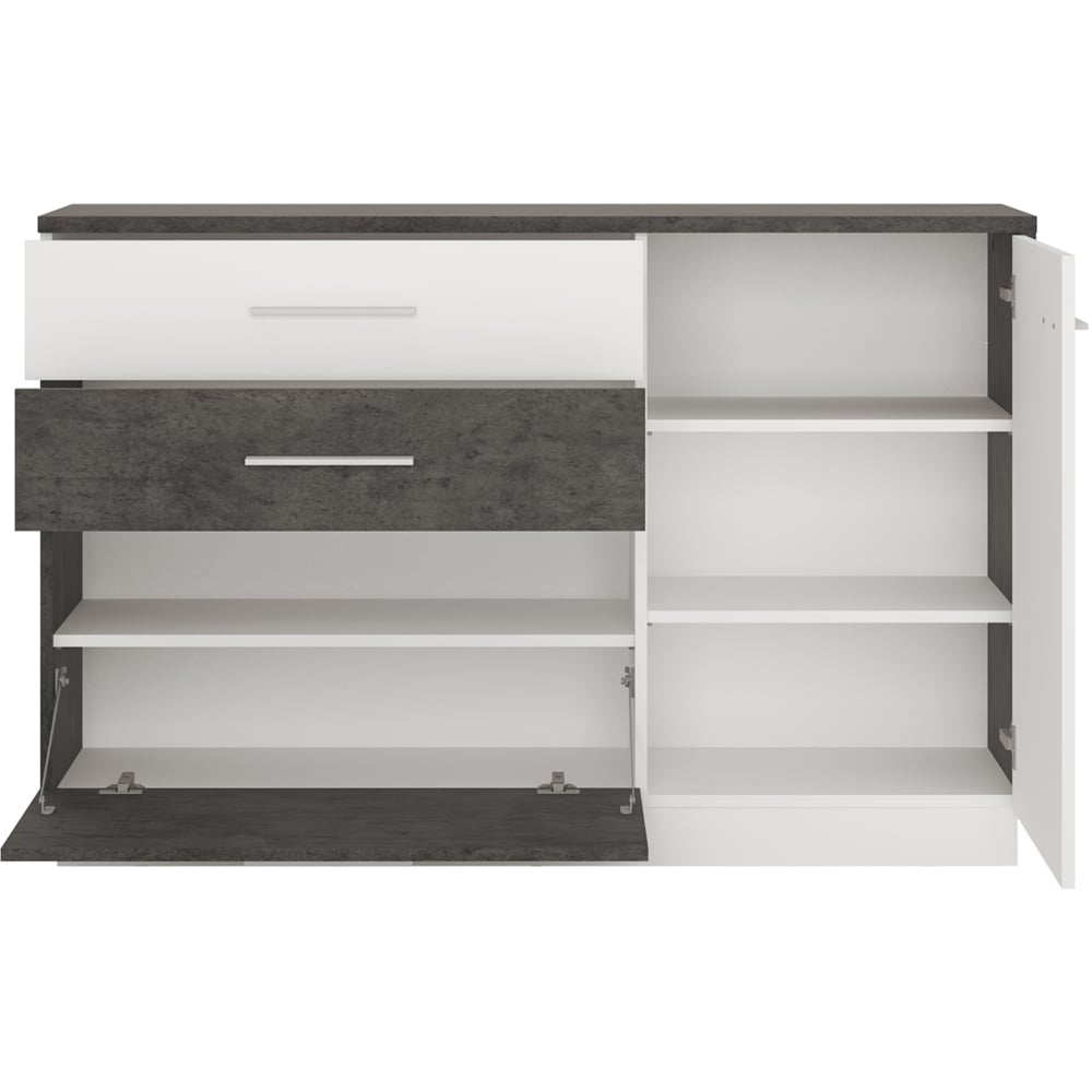Like most pieces of this range, the sideboard has a modern look which comes from the contrasting tones and the asymmetric design – this is an attractive piece which doesn’t take up a great deal of room but still provides plenty of usable storage space.