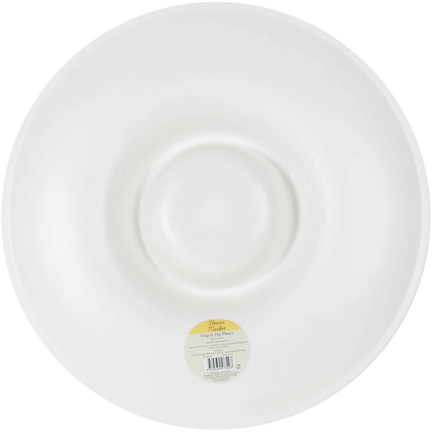 Brighten up your gatherings with the Flower Market Chip and Dip Platter, a delightful addition for spring and summer festivities. Designed with a convenient compartment for dips, this platter makes serving snacks like crisps and crudités effortless and stylish. Adorned with a vibrant floral pattern, it will add a touch of colour to your table for garden parties, barbecues, and more. Height: 5cm. Diameter: 33cm. Weight: 115g. Dishwasher Safe: No.