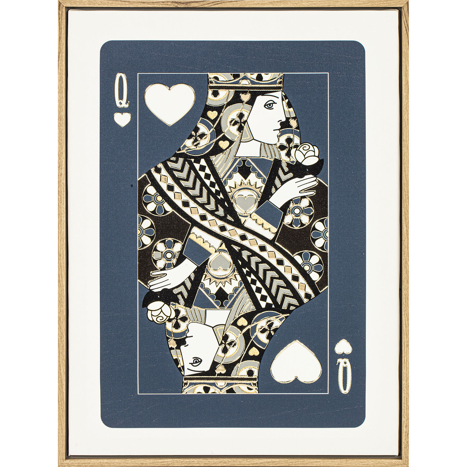 Give an artistic touch to your decor with this Foiled Playing Cards Framed Canvas. Available in an assortment of queen or king card designs, each features a playing card with embossed gold foil detailing. Complete with hooks for hanging, it'll make an elegant addition to any modern decor theme.