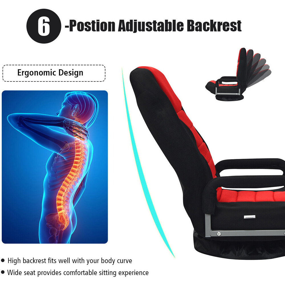 Get ready for some fun while relaxing with the Costway Red Swivel Gaming Chair with Adjustable Backrest. This exquisite chair is constructed using a heavy-duty steel frame for durability and longevity. It is upholstered using soft mesh fabric with cosy sponge padding for utmost comfort. It features an ergonomic design with a six-position adjustable backrest and padded armrests for ultimate relaxation. It also features a 360-degree swivel mechanism with a sturdy round base for stability and support. It has a load-bearing capacity of 150kg with a removable and washable base cover for easy maintenance. This chair has a foldable backrest that makes it highly portable and easy for storage and transportation.