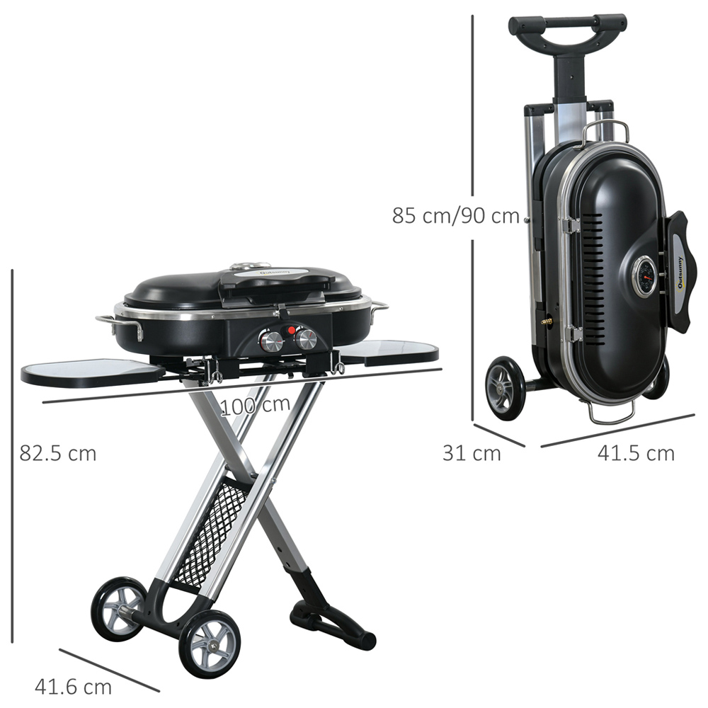 Make a perfect addition to your outdoor space with this Black Foldable Gas BBQ Grill with Extended Tables and Wheels from Outsunny. This device comes with two adjustable gas burners on each side to create different cooking areas perfect for meats, vegetables, breads, and other foods. Made from powder-coated metal, it's durable and includes a cool-touch handle on the lid to open and close safely. The unit is complete with a thermometer to keep track of the temperature when the lid is closed. Easy to move, the device has a smart suitcase design that makes folding, carrying, or moving it very simple. Size: 100 x 82.5 x 41.6cm (when open) and 90 x 31 x 41.5cm (when folded). Keep your BBQ covered and protected with our range of premium BBQ covers.