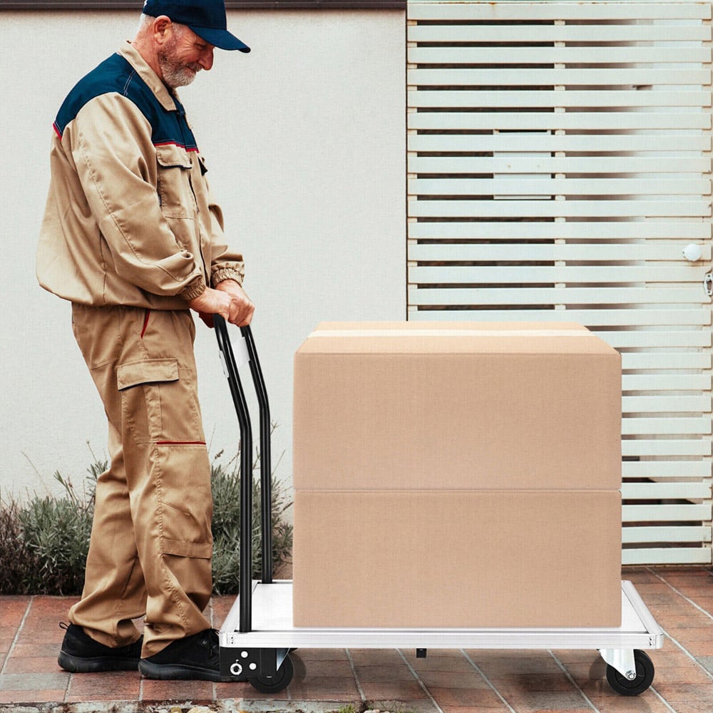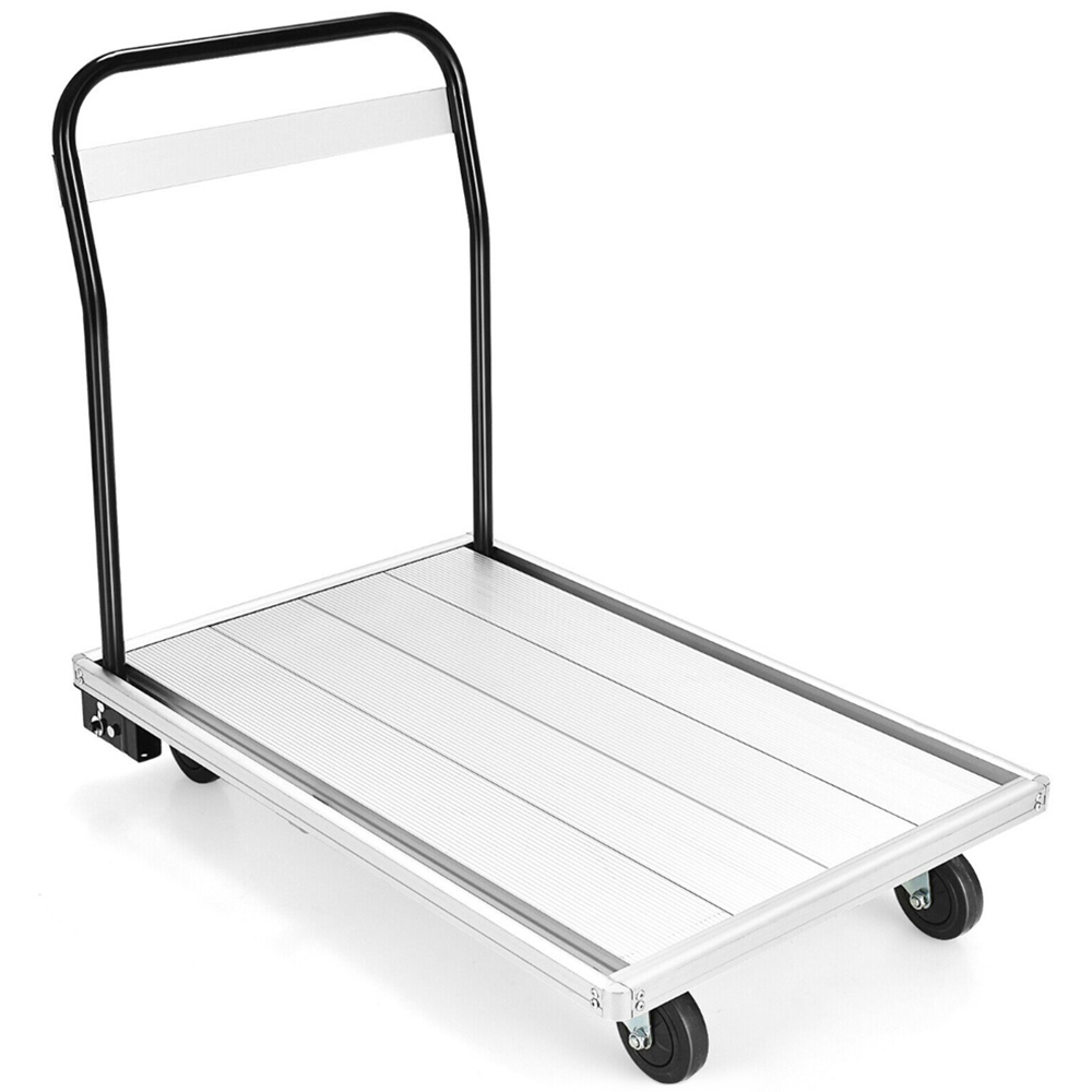 Transport heavy or bulky items with the Costway Folding Aluminum Alloy Platform Cart with Wheels 350kg. This push cart can support up to 350kg, making it suitable for carrying cargo, luggage, and storage boxes. The cart features two directional TPR wheels for smooth movement and two universal TPR wheels for easy direction changes. A protective baffle safeguards your goods and adds strength, while reinforced connections provide stability. The rounded safety corners help avoid scratches, and the non-slip surface prevents items from sliding off. When not in use, the cart conveniently folds into a compact size for easy storage in tight spaces. You can effortlessly push it using the ergonomic handle. Constructed from high-quality aluminium alloy and solid steel, this heavy-duty platform cart ensures a long-lasting lifespan. The folding design allows you to easily transport and store the flatbed cart. Simply step on the bottom bar and push the handle to fold it down to a compact size, making it easy to fit in the trunk of your vehicle for carrying anywhere. The protective baffle enhances strength and keeps goods secure in the cart, while reinforced connections ensure stability and prevent collapse. Additionally, the rounded safety corners increase security by minimizing the risk of accidental scratches.