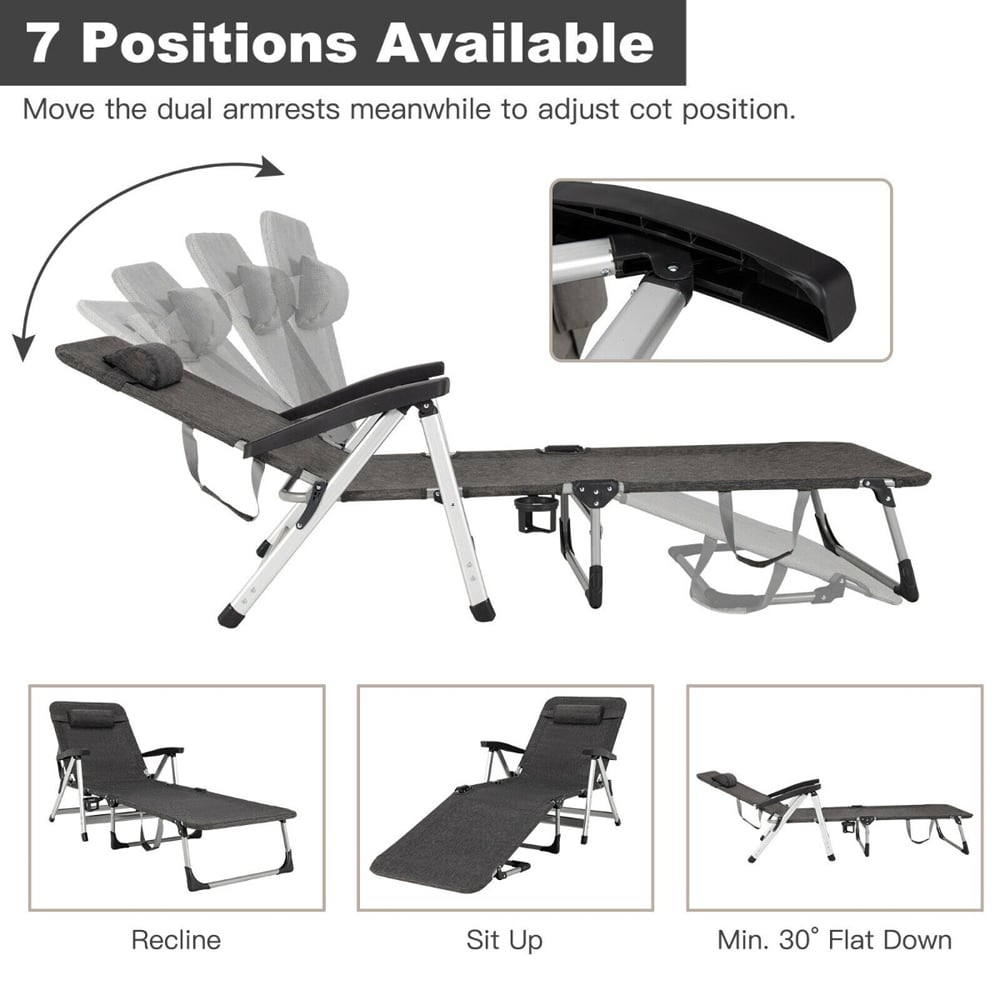 Enhance your outdoor relaxation with the Costway Grey Foldable Outdoor Chaise Lounger with Detachable Pillow, a must-have that combines comfort and convenience effortlessly. Boasting a robust flat aluminium frame, this lounger supports up to 150kg and offers exceptional stability. It features seven adjustable backrest positions and two footrest settings to cater to your comfort needs, whether reading, napping, or enjoying a drink using the built-in rotatable cup holder. The removable sponge headrest ensures your head and neck are well-supported for ultimate relaxation. Its high-density fabric is not only waterproof and wear-resistant but also promotes airflow for a cool and comfortable experience. Thanks to its portable triple folding design, you can easily transport and store this lounger, making it perfect for the beach, poolside, or backyard.