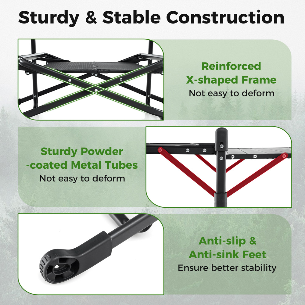 Bring convenience and organisation to every adventure with the Costway Portable Folding Cook Station with Aluminium Tabletop. Designed for hassle-free outdoor cooking, it offers a roll-up aluminium tabletop, four fold-out side tables for extra workspace, and a lower storage rack for all your utensils and supplies. It also includes hooks for hanging glasses, a recessed design for putting spice jars, and a paper towel holder, keeping everything within reach. Setting up is a breeze; simply unfold, and lock the tabletop, and your outdoor kitchen is ready in just 15 seconds. Built from heat-resistant and abrasion-resistant aluminium, the tabletop is sturdy, waterproof, and stain-resistant, making clean-up quick and easy. Reinforced with powder-coated metal tubes and X-shaped frames, this cook station is stable and reliable on all terrains, with anti-slip and anti-sink feet for added security. Perfect for road trips, camping, picnics, and backyard barbecues, this versatile cook station comes with a carry bag for easy transport and storage. It’s the ultimate addition to any outdoor event, bringing ease and functionality to all your cooking needs.