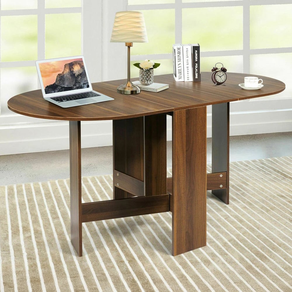 Get creative with your home setup using the Costway Wooden Foldable Drop Leaf Table. It features a sturdy construction with special holes at the bottom for hidden buckles, which keep the table stable during use. This table can hold up to 60kg, making it strong enough for books, plants, computers, and more. Safety is a priority with this table as it boasts round corners, ensuring that children are safe from bumps and bruises while dining. Crafted from premium engineered wood, the table is odourless and eco-friendly, promoting health in your home. It is perfect for dinner parties, daily writing, and internet surfing. When fully extended, it serves as a spacious dining table. This versatile table with a super spacious desktop is suitable for four to six people to sit around. It can also be adjusted to work as an office desk or folded down to fit neatly in a corner. When not in use, simply drop down two leaves and store the table in the corner to save space. Setting up the table is quick and easy. The package includes a detailed manual with numbered parts and steps to guide you through assembly. Cleaning is just as simple; use a damp cloth to wipe the smooth surface and keep it looking great.