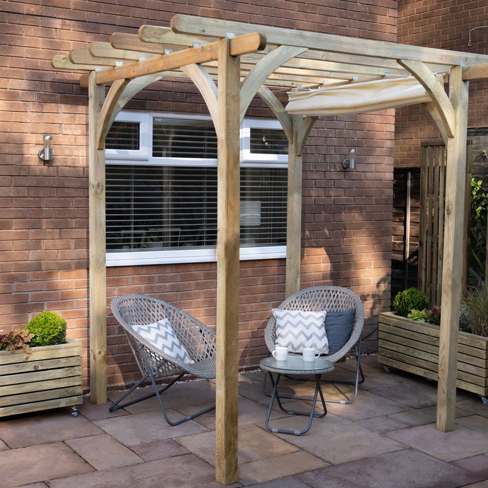 Create a beautiful garden feature with the large Ultima Pergola from Forest. Grow a climbing plant across the top of the structure, such as wisteria to create a stunning scented walk-way. The pergola is manufactured from Pressure Treated timber, which comes with a 15 year guarantee against rot and fungal decay. The structure has also been smooth-planed to give it a splinter-free finish. The posts of the pergola can be sunk into the ground to keep it secure. This pergola comes with an attractive waterproof canopy on metal runners that can be open or shut. Delivered flat packed with all fixtures needed, and easy-to-follow instructions. Also available in a smaller size. Please Note: Orders to the following postal codes may be subject to longer leads than advertised: