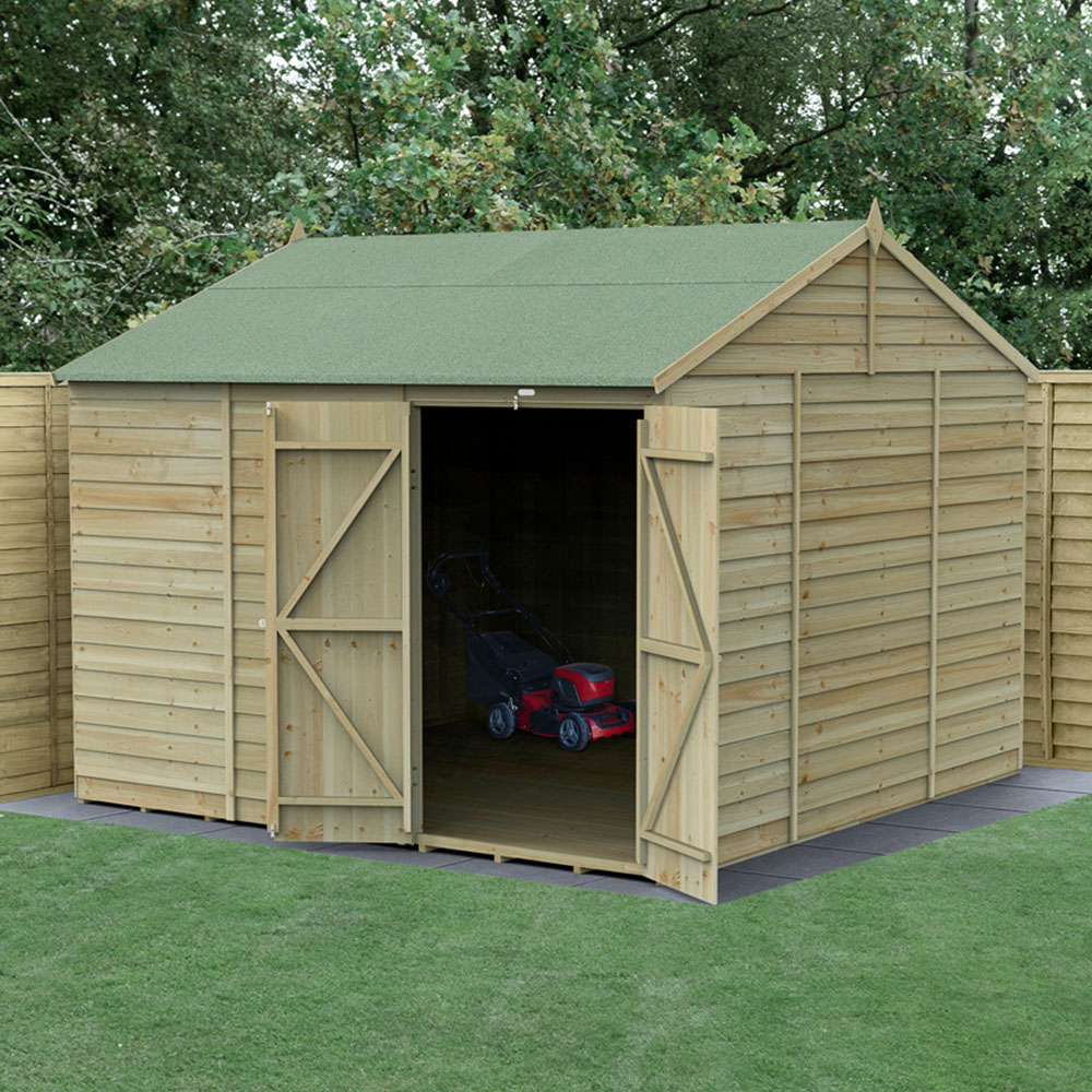 Store your logs or garden accessories safely with this 4LIFE 10 x 10ft Double Door Overlap Pressure Treated Reverse Apex Shed by Forest Garden. This shed features an improved design with modular panels. Its reverse apex roof makes it ideal for positioning against a wall and allows the interior space to be used for its most significant storage potential. Supported by 30%-thicker framing, it is built using straight-cut seven mm boards that overlap to give flexibility, allowing natural movement of the timber and aiding rainwater run-off. The pressure treatment that has been applied provides a 25-year anti-rot guarantee, giving you maintenance freedom and eliminating preservative treatment. Compared with standard sheds, this garden shed features a solid timber floor, allowing for storing heavier items. The roof of this pent shed is made from a hardwearing eight mm solid sheet and finished with a green mineral felt cover for complete weatherproof protection. It also features a double-Z frame to increase strength and prevent door movement. The security is enhanced with hidden hinges and a padlock-ready simple and secure hasp with a staple latch to keep valuable items safe (padlock not included). Its door can also be fitted with a left or right-hand opening, depending on your choice. The shed has shatter-proof PET glazing, which is more secure than traditional glass and does not yellow or fade over time. This wooden shed will look good in any garden with its conventional apex roof, smooth-planed barge sheds, and diamond-shaped finial. It is handcrafted in the UK using FSC-certified timber and comes with a complete set of fixings with clear instructions to help you achieve a straightforward assembly. Also, remember to build lean-to at the same time as the shed. This shed is delivered free to most UK addresses, using Forest Garden's White Glove Delivery Service, so it will be dropped off wherever you want it in your garden, with all packaging removed. Please Note: Orders to the following postal codes may be subject to longer leads than advertised: