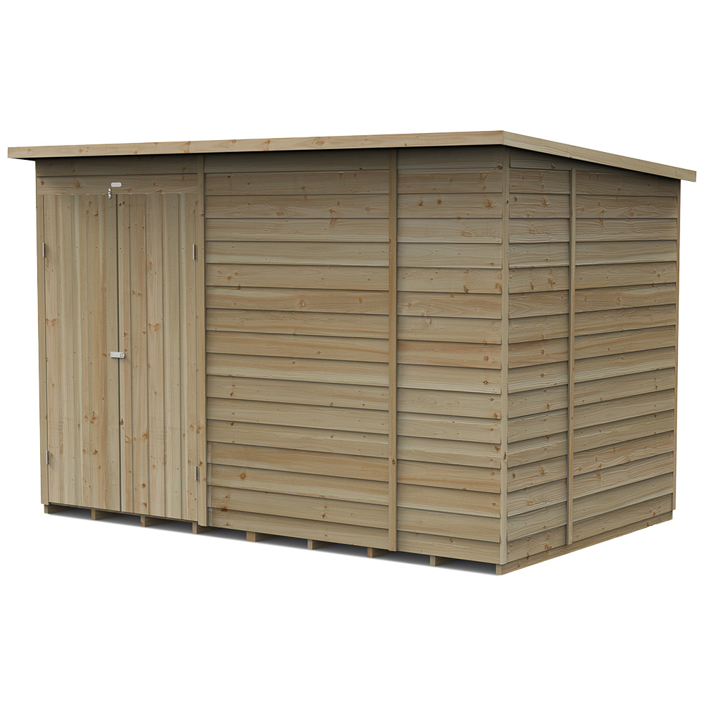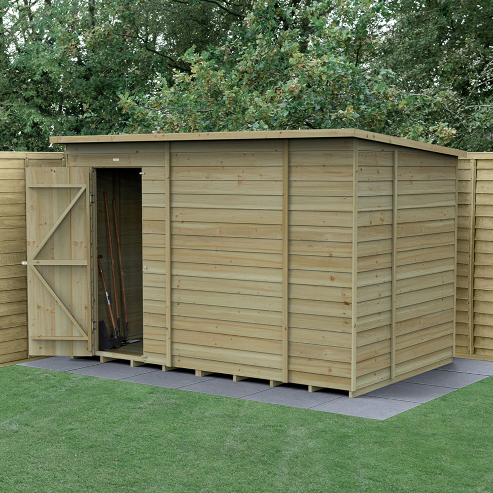 Keep your garden clutter-free with secure space to store garden equipment with this 4LIFE 10 x 6ft Single Door Overlap Pressure Treated Pent Shed by Forest Garden. This shed features an improved design with modular panels. Supported by 30%-thicker framing, it is constructed using straight-cut seven mm boards that overlap to give flexibility, allowing natural movement of the timber and aiding rainwater run-off. The pressure treatment that has been applied provides a 25-year anti-rot guarantee, giving you maintenance freedom and eliminating preservative treatment. Compared with standard sheds, this garden shed features a solid timber floor, allowing for storing heavier items. The roof of this pent shed is made from a hardwearing eight mm solid sheet and finished with a green mineral felt cover for complete weatherproof protection. It also features a double-Z frame to increase strength and prevent door movement. The security is enhanced with hidden hinges and a padlock-ready simple and secure hasp with a staple latch to keep valuable items safe (padlock not included). Its door can also be fitted with a left or right-hand opening, depending on your choice. The shed has shatter-proof PET glazing, which is more secure than traditional glass and does not yellow or fade over time. This wooden shed will look good in any garden with its conventional pent roof, smooth-planed barge sheds, and diamond-shaped finial. It is handcrafted in the UK using FSC-certified timber and comes with a complete set of fixings with clear instructions to help you achieve a straightforward assembly. This shed is delivered free to most UK addresses, using Forest Garden's White Glove Delivery Service, so it will be dropped off wherever you want it in your garden, with all packaging removed. Please Note: Orders to the following postal codes may be subject to longer leads than advertised: