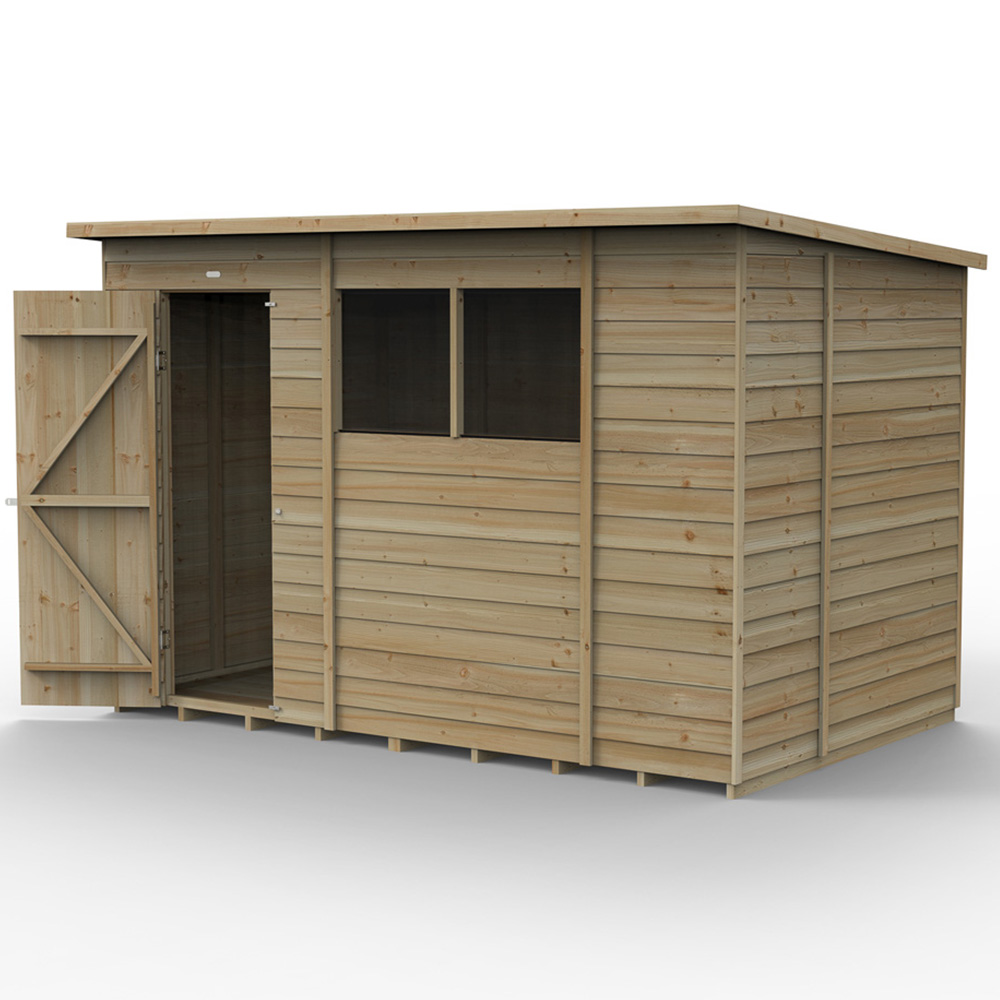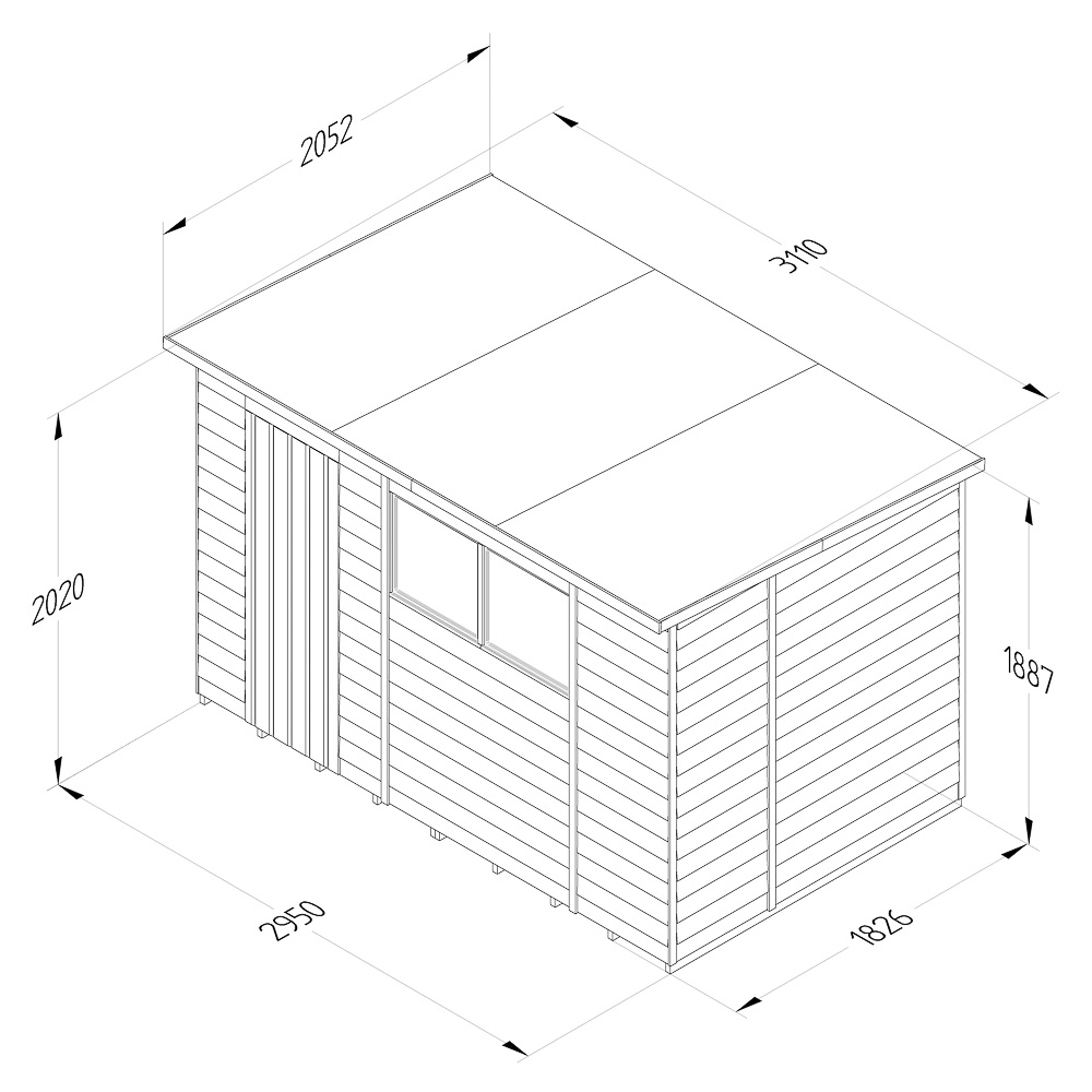 Keep your garden clutter-free with secure space to store garden equipment with this 4LIFE 10 x 6ft Single Door Two Windows Overlap Pressure Treated Pent Shed by Forest Garden. This shed features an improved design with modular panels. Supported by 30%-thicker framing, it is constructed using straight-cut seven mm boards that overlap to give flexibility, allowing natural movement of the timber and aiding rainwater run-off. The pressure treatment that has been applied provides a 25-year anti-rot guarantee, giving you maintenance freedom and eliminating preservative treatment. Compared with standard sheds, this garden shed features a solid timber floor, allowing for storing heavier items. The roof of this pent shed is made from a hardwearing eight mm solid sheet and finished with a green mineral felt cover for complete weatherproof protection. It also features a double-Z frame to increase strength and prevent door movement. The security is enhanced with hidden hinges and a padlock-ready simple and secure hasp with a staple latch to keep valuable items safe (padlock not included). Its door can also be fitted with a left or right-hand opening, depending on your choice. The shed has shatter-proof PET glazing, which is more secure than traditional glass and does not yellow or fade over time. This wooden shed will look good in any garden with its conventional pent roof, smooth-planed barge sheds, and diamond-shaped finial. It is handcrafted in the UK using FSC-certified timber and comes with a complete set of fixings with clear instructions to help you achieve a straightforward assembly. This shed is delivered free to most UK addresses, using Forest Garden's White Glove Delivery Service, so it will be dropped off wherever you want it in your garden, with all packaging removed. Please Note: Orders to the following postal codes may be subject to longer leads than advertised: