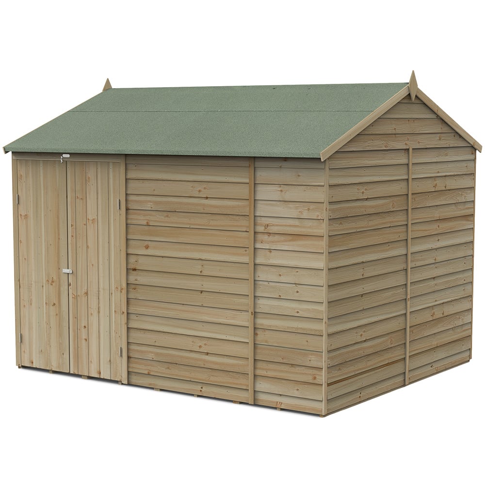 Store your logs or garden accessories safely with this 4LIFE 10 x 8ft Double Door Overlap Pressure Treated Reverse Apex Shed by Forest Garden. This shed features an improved design with modular panels. Its reverse apex roof makes it ideal for positioning against a wall and allows the interior space to be used for its most significant storage potential. Supported by 30%-thicker framing, it is built using straight-cut seven mm boards that overlap to give flexibility, allowing natural movement of the timber and aiding rainwater run-off. The pressure treatment that has been applied provides a 25-year anti-rot guarantee, giving you maintenance freedom and eliminating preservative treatment. Compared with standard sheds, this garden shed features a solid timber floor, allowing for storing heavier items. The roof of this pent shed is made from a hardwearing eight mm solid sheet and finished with a green mineral felt cover for complete weatherproof protection. It also features a double-Z frame to increase strength and prevent door movement. The security is enhanced with hidden hinges and a padlock-ready simple and secure hasp with a staple latch to keep valuable items safe (padlock not included). Its door can also be fitted with a left or right-hand opening, depending on your choice. The shed has shatter-proof PET glazing, which is more secure than traditional glass and does not yellow or fade over time. This wooden shed will look good in any garden with its conventional apex roof, smooth-planed barge sheds, and diamond-shaped finial. It is handcrafted in the UK using FSC-certified timber and comes with a complete set of fixings with clear instructions to help you achieve a straightforward assembly. Also, remember to build lean-to at the same time as the shed. This shed is delivered free to most UK addresses, using Forest Garden's White Glove Delivery Service, so it will be dropped off wherever you want it in your garden, with all packaging removed. Please Note: Orders to the following postal codes may be subject to longer leads than advertised: