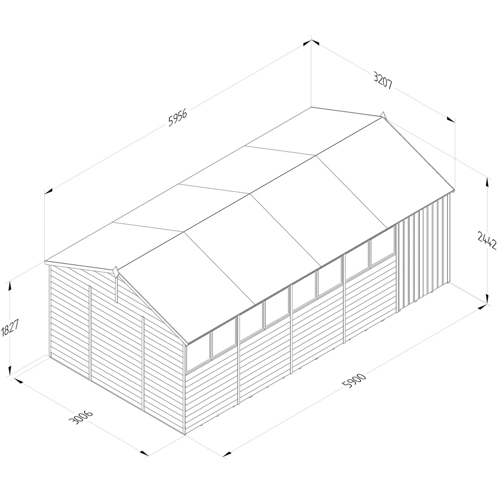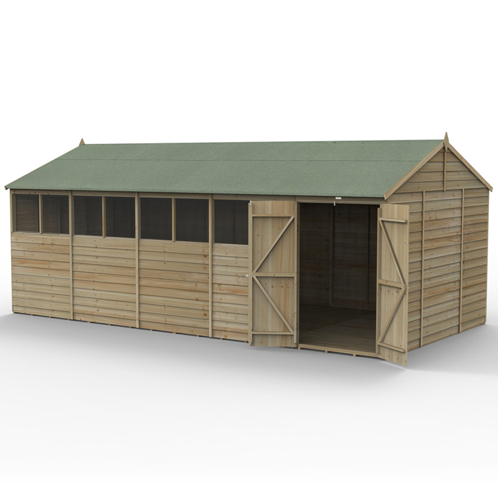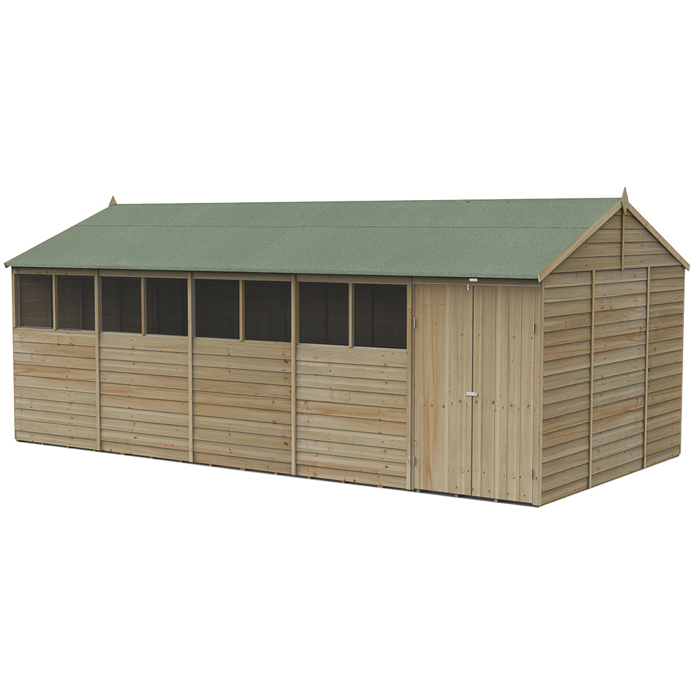 Store your logs or garden accessories safely with this 4LIFE 20 x 10ft Double Door Eight Windows Overlap Pressure Treated Reverse Apex Shed by Forest Garden. This shed features an improved design with modular panels. Its reverse apex roof makes it ideal for positioning against a wall and allows the interior space to be used for its most significant storage potential. Supported by 30%-thicker framing, it is built using straight-cut seven mm boards that overlap to give flexibility, allowing natural movement of the timber and aiding rainwater run-off. The pressure treatment that has been applied provides a 25-year anti-rot guarantee, giving you maintenance freedom and eliminating preservative treatment. Compared with standard sheds, this garden shed features a solid timber floor, allowing for storing heavier items. The roof of this pent shed is made from a hardwearing eight mm solid sheet and finished with a green mineral felt cover for complete weatherproof protection. It also features a double-Z frame to increase strength and prevent door movement. The security is enhanced with hidden hinges and a padlock-ready simple and secure hasp with a staple latch to keep valuable items safe (padlock not included). Its door can also be fitted with a left or right-hand opening, depending on your choice. The shed has shatter-proof PET glazing, which is more secure than traditional glass and does not yellow or fade over time. This wooden shed will look good in any garden with its conventional apex roof, smooth-planed barge sheds, and diamond-shaped finial. It is handcrafted in the UK using FSC-certified timber and comes with a complete set of fixings with clear instructions to help you achieve a straightforward assembly. Also, remember to build lean-to at the same time as the shed. This shed is delivered free to most UK addresses, using Forest Garden's White Glove Delivery Service, so it will be dropped off wherever you want it in your garden, with all packaging removed. Please Note: Orders to the following postal codes may be subject to longer leads than advertised: