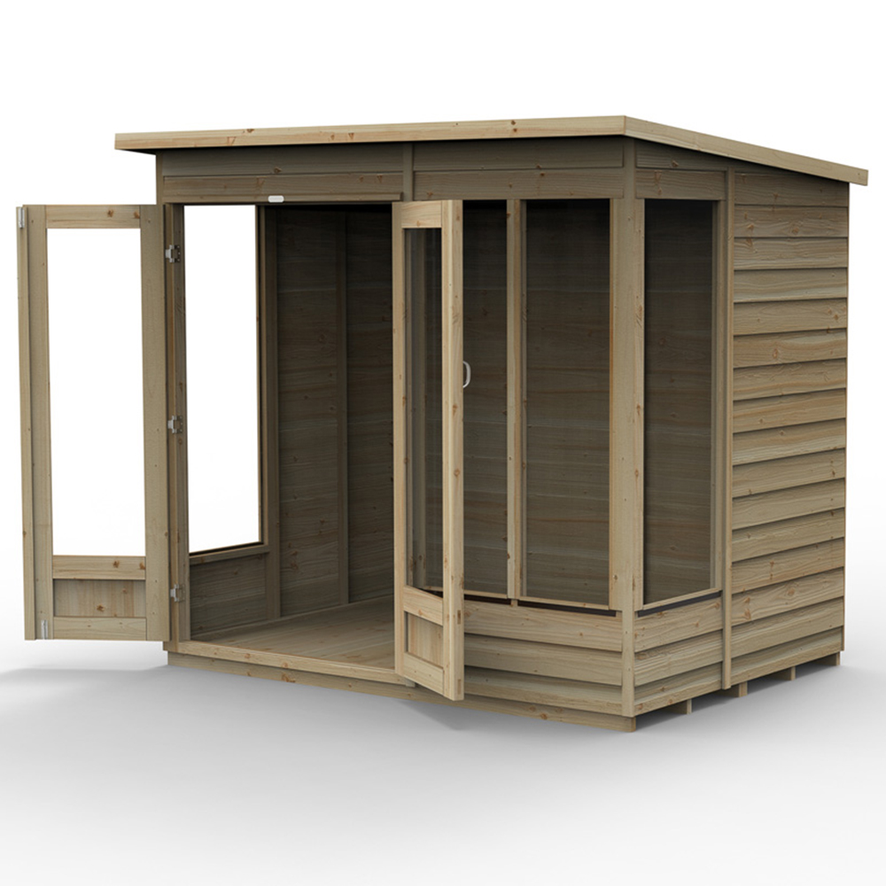 Experience the beauty of your outdoor space with the Forest Garden 4LIFE Double Door 4 Windows Pent Summerhouse. This charming structure is a wonderful addition to any garden, ideal for a hobby room or a cosy reading nook. The generous windows allow ample natural light to illuminate the interior. Constructed with overlap boards, this modular summerhouse is a fantastic enhancement for any outdoor space. With fully modular panels, it is delivered in smaller sections but with increased wood content, resulting in a simpler assembly process, greater flexibility in configuration, and a more robust structure. Treated with pressure, this summerhouse comes with a 25-year anti-rot guarantee, ensuring minimal maintenance and no need for preservative treatment. Built to withstand the test of time, it features a sturdy timber floor capable of supporting heavier items. The pent roof is crafted from durable 8mm solid sheet material and covered with a green sand-felt for complete weather protection. These premium garden buildings are crafted in the UK using FSC certified timber. All necessary fixtures, fittings, and felt are provided, along with clear assembly instructions. A stylish and modern addition to any garden, especially for those with limited space. Size: 7 x 5ft. Please Note: Orders to the following postal codes may be subject to longer leads than advertised: