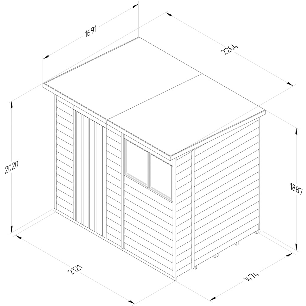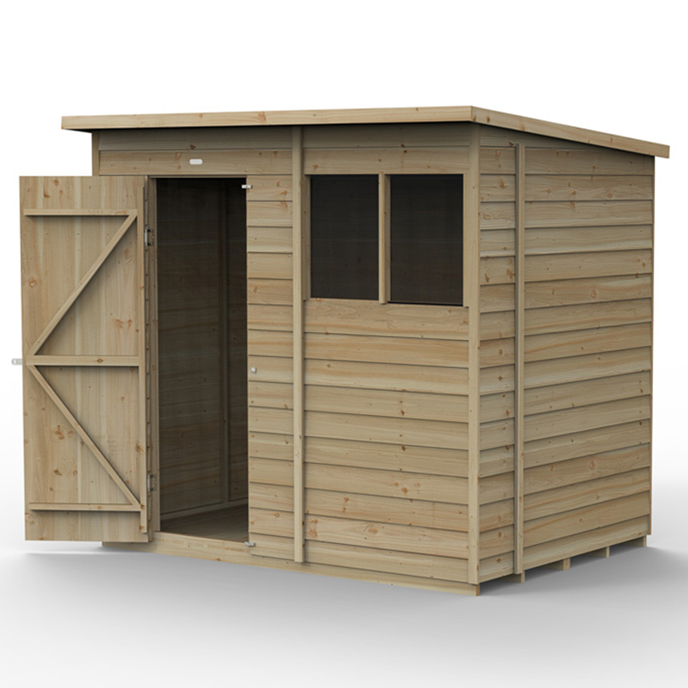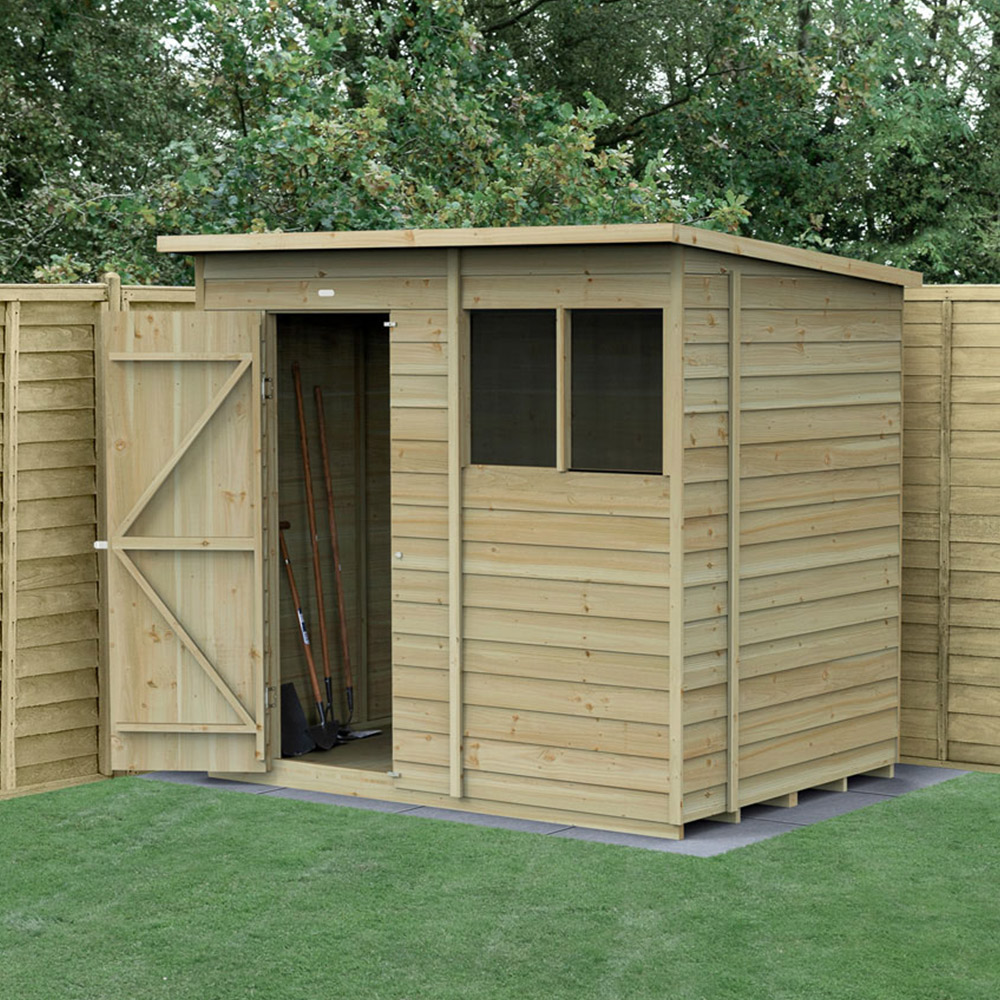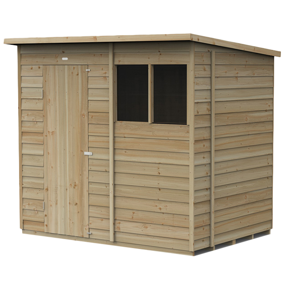 Keep your garden clutter-free with secure space to store garden equipment with this 4LIFE 7 x 5ft Single Door Two Windows Overlap Pressure Treated Pent Shed by Forest Garden. This shed features an improved design with modular panels. Supported by 30%-thicker framing, it is constructed using straight-cut seven mm boards that overlap to give flexibility, allowing natural movement of the timber and aiding rainwater run-off. The pressure treatment that has been applied provides a 25-year anti-rot guarantee, giving you maintenance freedom and eliminating preservative treatment. Compared with standard sheds, this garden shed features a solid timber floor, allowing for storing heavier items. The roof of this pent shed is made from a hardwearing eight mm solid sheet and finished with a green mineral felt cover for complete weatherproof protection. It also features a double-Z frame to increase strength and prevent door movement. The security is enhanced with hidden hinges and a padlock-ready simple and secure hasp with a staple latch to keep valuable items safe (padlock not included). Its door can also be fitted with a left or right-hand opening, depending on your choice. The shed has shatter-proof PET glazing, which is more secure than traditional glass and does not yellow or fade over time. This wooden shed will look good in any garden with its conventional pent roof, smooth-planed barge sheds, and diamond-shaped finial. It is handcrafted in the UK using FSC-certified timber and comes with a complete set of fixings with clear instructions to help you achieve a straightforward assembly. This shed is delivered free to most UK addresses, using Forest Garden's White Glove Delivery Service, so it will be dropped off wherever you want it in your garden, with all packaging removed. Please Note: Orders to the following postal codes may be subject to longer leads than advertised: