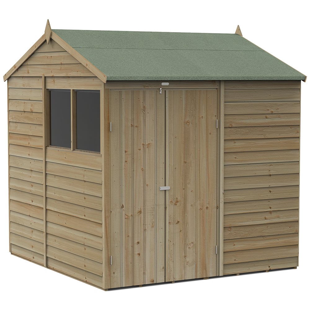 Store your logs or garden accessories safely with this 4LIFE 7 x 7ft Double Door Two Windows Overlap Pressure Treated Reverse Apex Shed by Forest Garden. This shed features an improved design with modular panels. Its reverse apex roof makes it ideal for positioning against a wall and allows the interior space to be used for its most significant storage potential. Supported by 30%-thicker framing, it is built using straight-cut seven mm boards that overlap to give flexibility, allowing natural movement of the timber and aiding rainwater run-off. The pressure treatment that has been applied provides a 25-year anti-rot guarantee, giving you maintenance freedom and eliminating preservative treatment. Compared with standard sheds, this garden shed features a solid timber floor, allowing for storing heavier items. The roof of this pent shed is made from a hardwearing eight mm solid sheet and finished with a green mineral felt cover for complete weatherproof protection. It also features a double-Z frame to increase strength and prevent door movement. The security is enhanced with hidden hinges and a padlock-ready simple and secure hasp with a staple latch to keep valuable items safe (padlock not included). Its door can also be fitted with a left or right-hand opening, depending on your choice. The shed has shatter-proof PET glazing, which is more secure than traditional glass and does not yellow or fade over time. This wooden shed will look good in any garden with its conventional apex roof, smooth-planed barge sheds, and diamond-shaped finial. It is handcrafted in the UK using FSC-certified timber and comes with a complete set of fixings with clear instructions to help you achieve a straightforward assembly. Also, remember to build lean-to at the same time as the shed. This shed is delivered free to most UK addresses, using Forest Garden's White Glove Delivery Service, so it will be dropped off wherever you want it in your garden, with all packaging removed. Please Note: Orders to the following postal codes may be subject to longer leads than advertised: