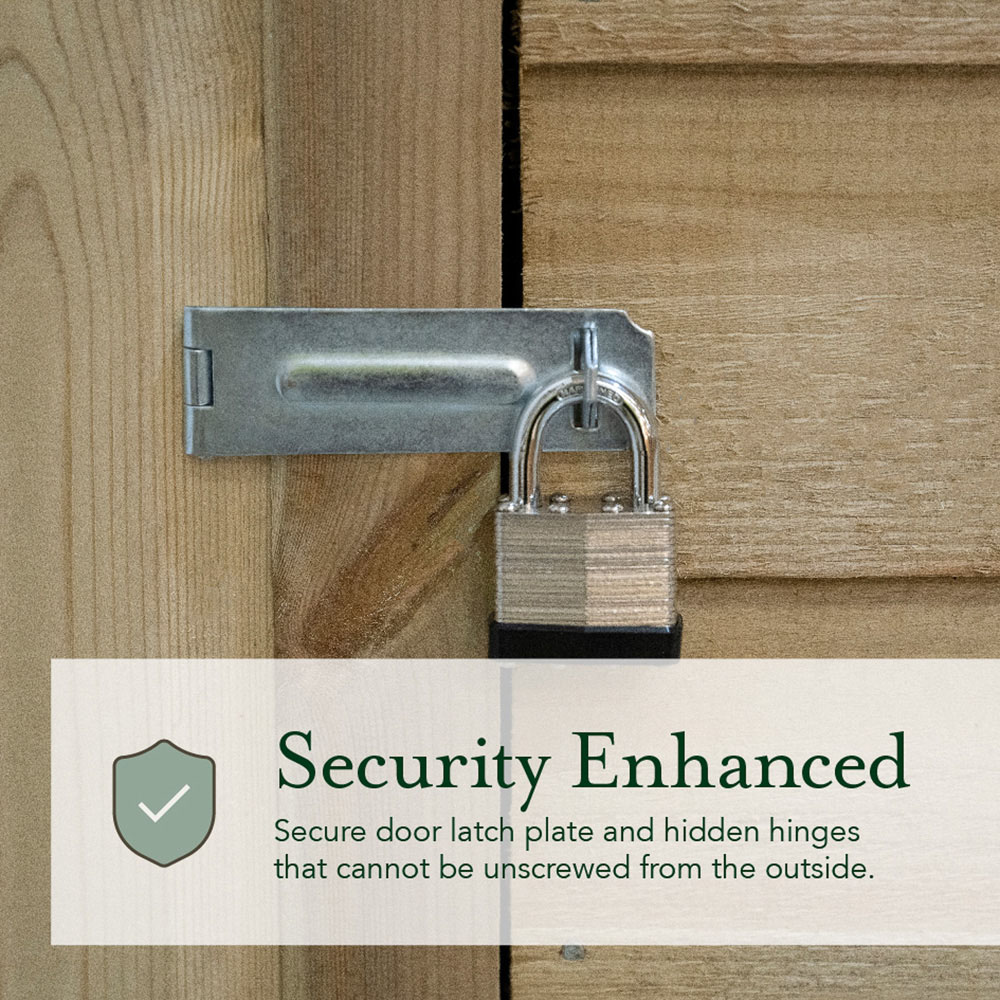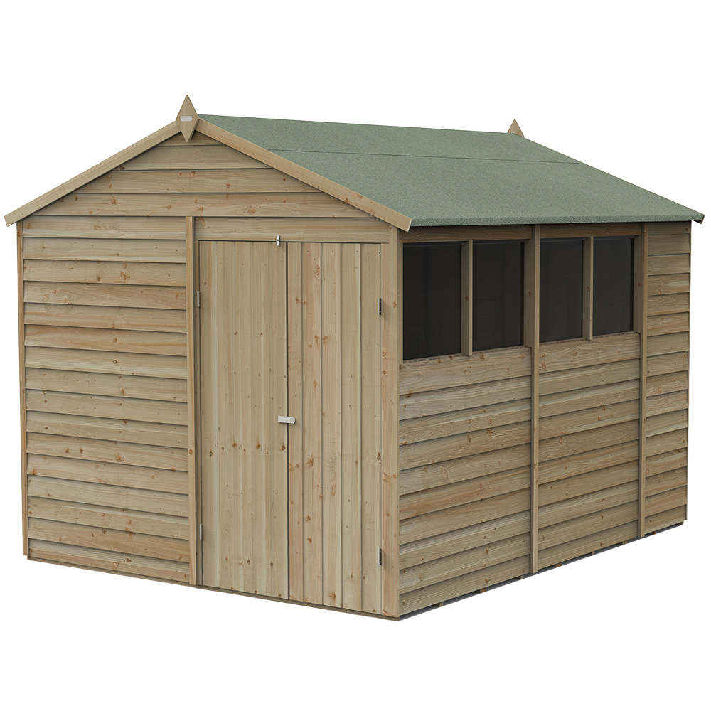 Make a practical and stylish addition to your outdoor space with this 4LIFE 8 x 10ft Double Door Four Windows Overlap Pressure Treated Apex Shed by Forest Garden. This shed features an improved design with modular panels. Supported by 30%-thicker framing, it is constructed using straight-cut seven mm boards that overlap to give flexibility, allowing natural movement of the timber and aiding rainwater run-off. The pressure treatment that has been applied provides a 25-year anti-rot guarantee, giving you maintenance freedom and eliminating preservative treatment. Compared with standard sheds, this garden shed features a solid timber floor, allowing for storing heavier items. The roof of this pent shed is made from a hardwearing eight mm solid sheet and finished with a green mineral felt cover for complete weatherproof protection. It also features a double-Z frame to increase strength and prevent door movement. The security is enhanced with hidden hinges and a padlock-ready simple and secure hasp with a staple latch to keep valuable items safe (padlock not included). Its door can also be fitted with a left or right-hand opening, depending on your choice. The shed has shatter-proof PET glazing, which is more secure than traditional glass and does not yellow or fade over time. This wooden shed will look good in any garden with its conventional apex roof, smooth-planed barge sheds, and diamond-shaped finial. It is handcrafted in the UK using FSC-certified timber and comes with a complete set of fixings with clear instructions to help you achieve a straightforward assembly. This shed is delivered free to most UK addresses, using Forest Garden's White Glove Delivery Service, so it will be dropped off wherever you want it in your garden, with all packaging removed. Please Note: Orders to the following postal codes may be subject to longer leads than advertised: