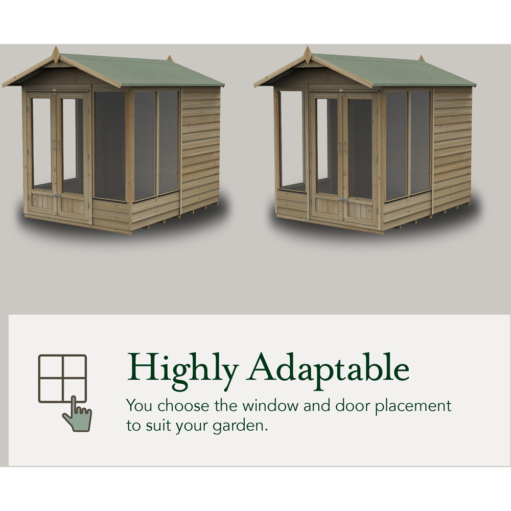 Experience the beauty of your outdoor space with the Forest Garden 4LIFE 6 x 4ft Double Door 5 Windows Apex Summerhouse. This stylish and modern summerhouse offers a contemporary twist on traditional designs and is a cosy addition to any garden. Featuring large windows that let in ample natural light, it offers an ideal space for a hobby room or reading book. Constructed with overlap boards, this modular summerhouse enhances any garden setting. Its innovative design includes fully modular panels, allowing for delivery in smaller sections. This results in more wood, making assembly easier, providing versatile configurations, and creating a sturdier structure. The pressure treatment applied to the wood ensures a 25-year anti-rot guarantee, meaning you won’t need to worry about maintenance or preservative treatments. Unlike many summerhouses that use oriented strand board (OSB), this model features a solid timber floor, allowing for the storage of heavier items. The apex roof is made from a durable 8mm solid sheet, topped with a green sand-felt cover for complete weatherproof protection. Manufactured in the UK with FSC-certified timber, these high-quality garden buildings come with all necessary fixtures, fittings, and felt for construction, along with easy-to-follow instructions. Additionally, the extended roof overhang provides extra shade and protection from the elements while giving the summerhouse a classic and attractive appearance. Please Note: This order is delivered flat packed for easy self-assembly. Orders to the following postal codes may be subject to longer leads than advertised: BN1-BN3, BN5-BN18, BN20-BN27, BN41-BN45, BR8, CB1-CB4, CB6-CB8, CO1-CO16, CT1-CT21, EX1-EX24, EX31-EX39, GU6, GU28, IP1-IP33, ME1-ME20, NR1-NR35, PE14-PE30, PE38, PL1-PL29, RH6-RH20, TN1-TN40, TQ1-TQ14, TR1-TR20, TR26-TR27. Deliveries to mainland Scotland can take up to 10 working days more than the advertised lead-times.