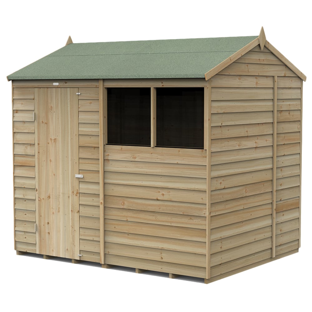 Store your logs or garden accessories safely with this 4LIFE 8 x 6ft Single Door Two Windows Overlap Pressure Treated Reverse Apex Shed by Forest Garden. This shed features an improved design with modular panels. Its reverse apex roof makes it ideal for positioning against a wall and allows the interior space to be used for its most significant storage potential. Supported by 30%-thicker framing, it is built using straight-cut seven mm boards that overlap to give flexibility, allowing natural movement of the timber and aiding rainwater run-off. The pressure treatment that has been applied provides a 25-year anti-rot guarantee, giving you maintenance freedom and eliminating preservative treatment. Compared with standard sheds, this garden shed features a solid timber floor, allowing for storing heavier items. The roof of this pent shed is made from a hardwearing eight mm solid sheet and finished with a green mineral felt cover for complete weatherproof protection. It also features a double-Z frame to increase strength and prevent door movement. The security is enhanced with hidden hinges and a padlock-ready simple and secure hasp with a staple latch to keep valuable items safe (padlock not included). Its door can also be fitted with a left or right-hand opening, depending on your choice. The shed has shatter-proof PET glazing, which is more secure than traditional glass and does not yellow or fade over time. This wooden shed will look good in any garden with its conventional apex roof, smooth-planed barge sheds, and diamond-shaped finial. It is handcrafted in the UK using FSC-certified timber and comes with a complete set of fixings with clear instructions to help you achieve a straightforward assembly. Also, remember to build lean-to at the same time as the shed. This shed is delivered free to most UK addresses, using Forest Garden's White Glove Delivery Service, so it will be dropped off wherever you want it in your garden, with all packaging removed Please Note: Orders to the following postal codes may be subject to longer leads than advertised: