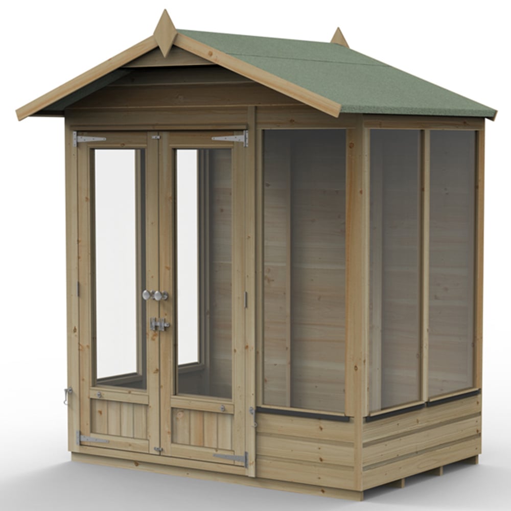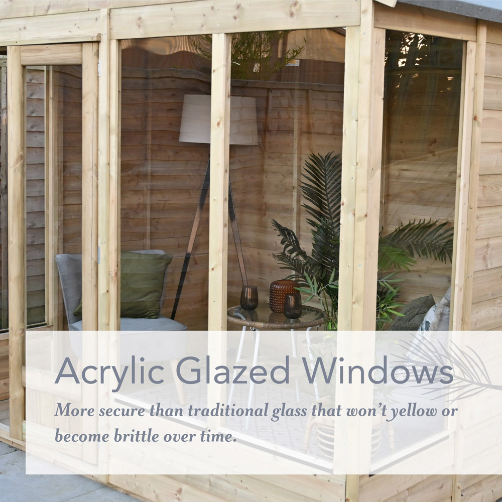 Step into timeless elegance with our NEW Beckwood Shiplap Summerhouses. Crafted with precision and style, the shiplap construction not only provides durability, but imparts a classic coastal-inspired charm to your garden. Unwind in a space where quality meets sophistication and every summer promises lasting memories in a haven built to endure the test of time. Beckwood summerhouses are completely maintenance free – annual preservative treatment is NEVER needed. Pressure treated timber provides a 25 year anti-rot guarantee, the longest guarantee in the market. The tongue and groove design ensures a seamless, interlocking fit, enhancing both structural integrity and aesthetic. The robust and stable tongue and groove pressure treated boarded floor is stronger than normal OSB sheet flooring, offering better weight-bearing capabilities for things such as furniture. Please Note: Orders to the following postal codes may be subject to longer leads than advertised: