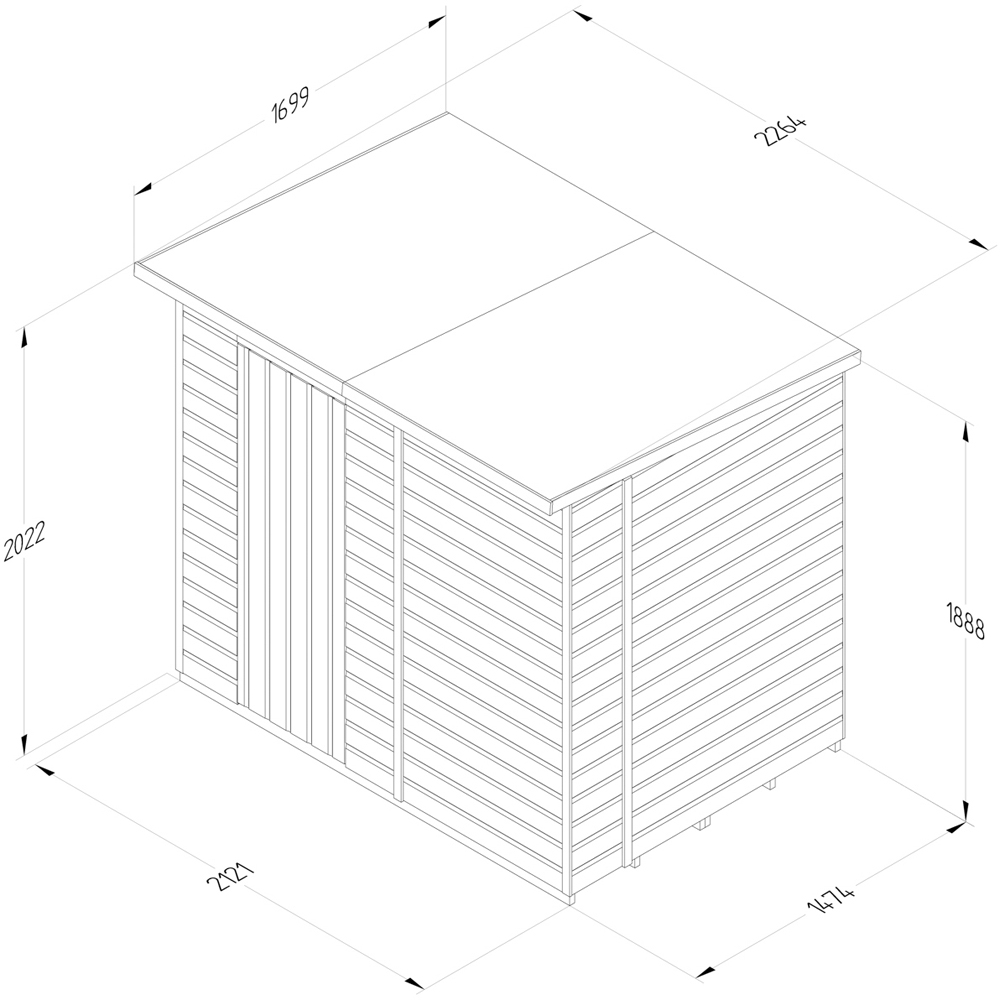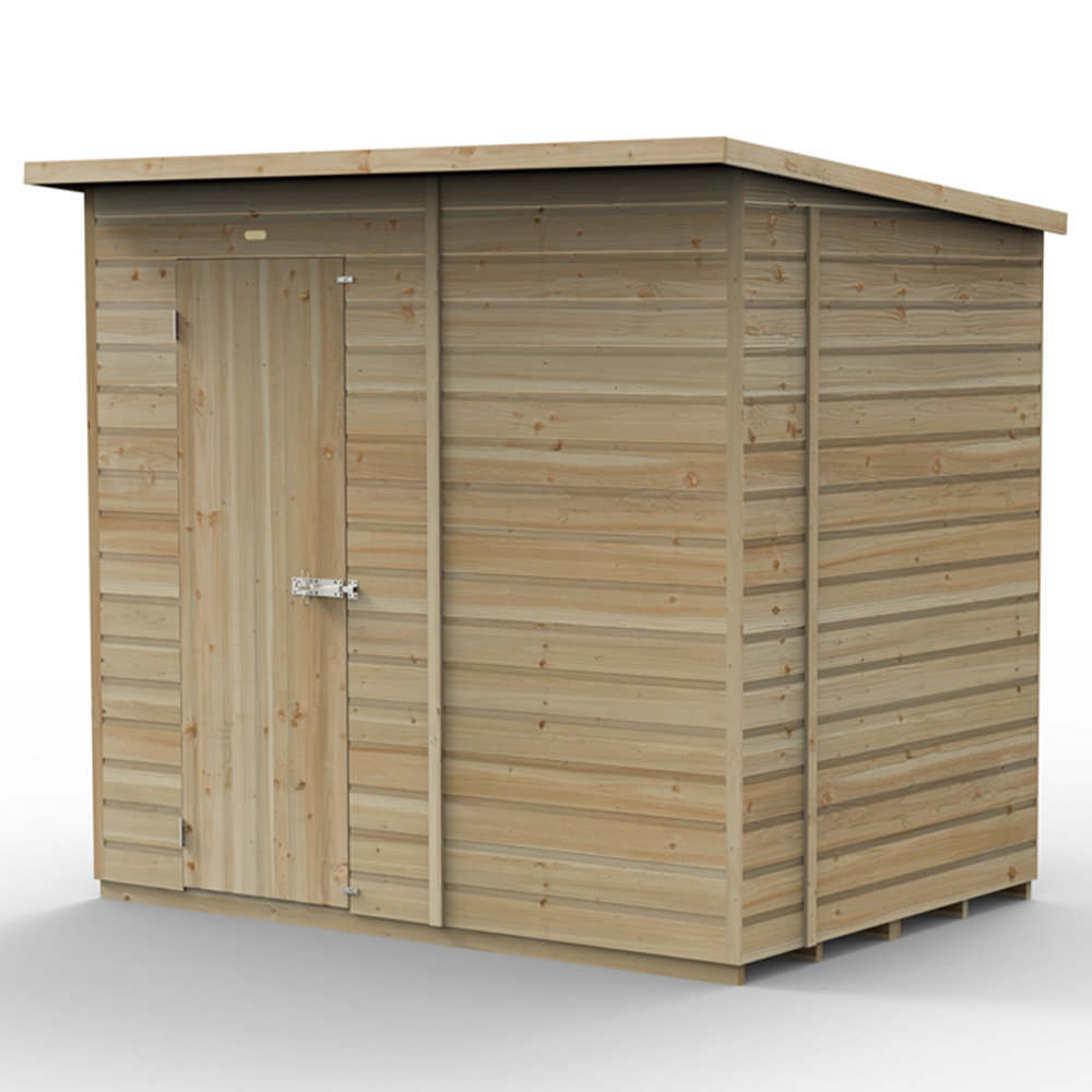 The Beckwood Shiplap Pressure Treated 7x5 Pent Shed with No Windows - With Base from Forest has traditional and sturdy design and is built in Britain for Britain. Built to withstand the elements, the shed can store anything from a simple spade to bikes, fishing equipment or outward bound gear! The shed's improved FULLY modular design features smaller sections, same size panels are fully interchangeable. The shed is made using robust, interlocking, weather-beating pressure treated shiplap cladding throughout, giving it a watertight seal. Supported by 30%-thicker framing than found on most wooden sheds, this 7x5 shed is constructed to last. The pressure treatment that has been applied gives this shed a 25-year anti-rot guarantee, giving you complete maintenance freedom, annual preservative treatment is NEVER needed! Most other sheds require treatment once built then yearly thereafter. Rather than the more common OSB (oriented strand board), this 7x5 shed features an extra-thick interlocking tongue and grove floor allowing for the storage of heavier items. The roof of this pent shed is made from hardwearing 8mm solid sheet, finished with a durable, high quality green felt cover for complete weatherproof protection. This 7x5 shed’s door features a double-Z frame, giving strength and to prevent door movement. Security is enhanced with hidden hinges and a heavy duty, traditional pad bolt to keep valuable items safe (padlock not included). What’s more, the door can be fitted with a left or right-hand opening – the choice is yours. The Shed has acrylic glazing, which is more secure than traditional glass and does not yellow or fade over time. With its traditional pent roof, this wooden shed will look good in any garden. Handcrafted in the UK using FSC® certified timber, this garden shed comes with a full set of fixings and clear instructions to help you achieve a straightforward assembly. This shed is delivered free to most UK addresses, using Forest Garden's White Glove Delivery Service, so will be dropped off wherever you want it in your garden, with all packaging removed. This shed comes fully installed by our highly qualified fitting team. Please Note: Orders to the following postal codes may be subject to longer leads than advertised: