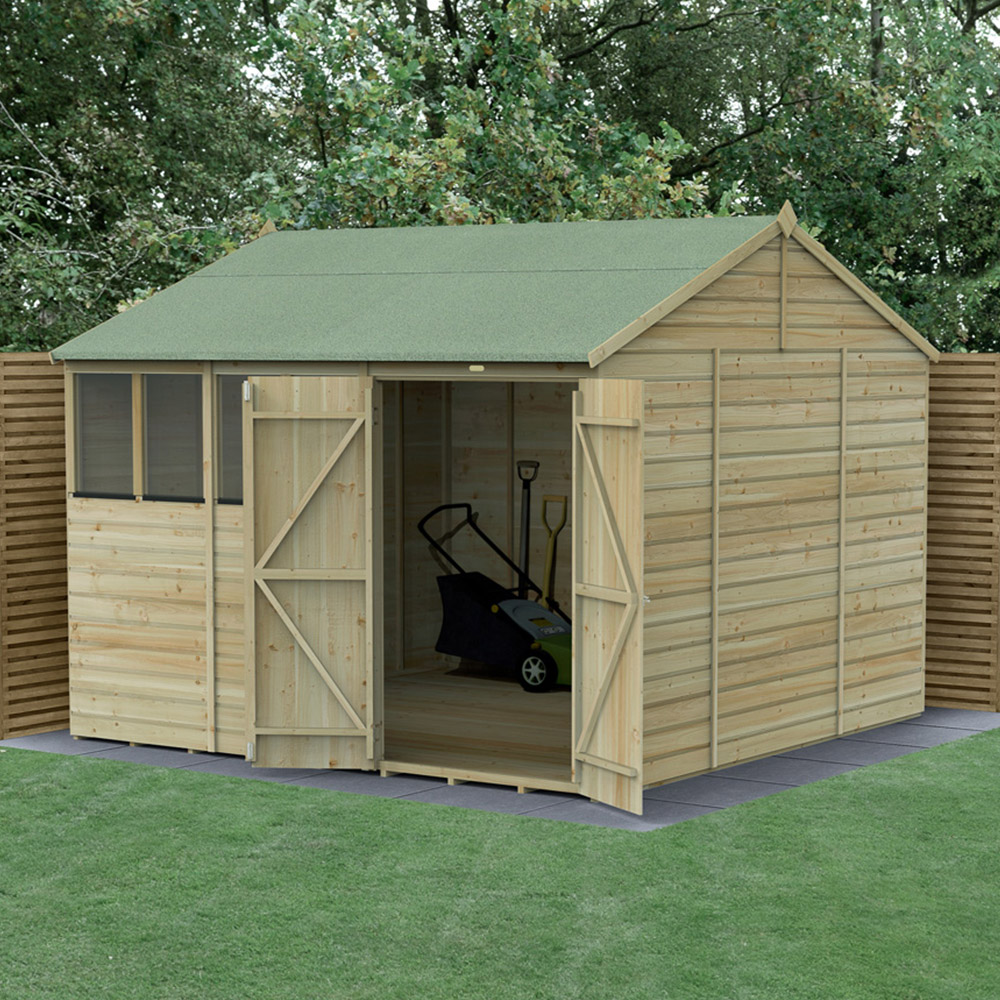 Create a safe storage space for your gardening tools Forest Garden Beckwood 10 x 10ft Double Door 4 Windows Shiplap Reverse Apex Shed. This shed is proudly designed and manufactured in Britain, ensuring its durability and quality. It is specifically built to withstand various weather conditions, making it a perfect choice for storing gardening tools, bicycles, fishing equipment, or outdoor gear. It is constructed using robust and interlocking pressure-treated shiplap cladding, ensuring a watertight seal. With 30 percent thicker framing compared to most wooden sheds, this shed is built to last. The pressure treatment applied to the wood provides a 25-year anti-rot guarantee, eliminating the need for annual preservative treatment. Furthermore, this shed features an extra-thick interlocking tongue and groove floor, making it suitable for storing heavier items. The roof is made from hardwearing 8mm solid sheet material, providing durability and protection. Security is a top priority with this shed. The door features a double-Z frame, offering strength and preventing door movement. Hidden hinges and a heavy-duty traditional pad bolt further enhance security, ensuring that your valuable items are safe (padlock not included). Additionally, the door can be fitted with a left or right-hand opening, giving you the flexibility to choose. With its reverse apex roof, this wooden shed will complement any garden beautifully. It comes with a full set of fixings and clear instructions to assist you in achieving a hassle-free assembly process. Note: It is delivered free to most UK addresses through Forest Garden's white glove delivery service, with drop-off in your desired garden location and packaging removal included. Please Note: Orders to the following postal codes may be subject to longer leads than advertised:
