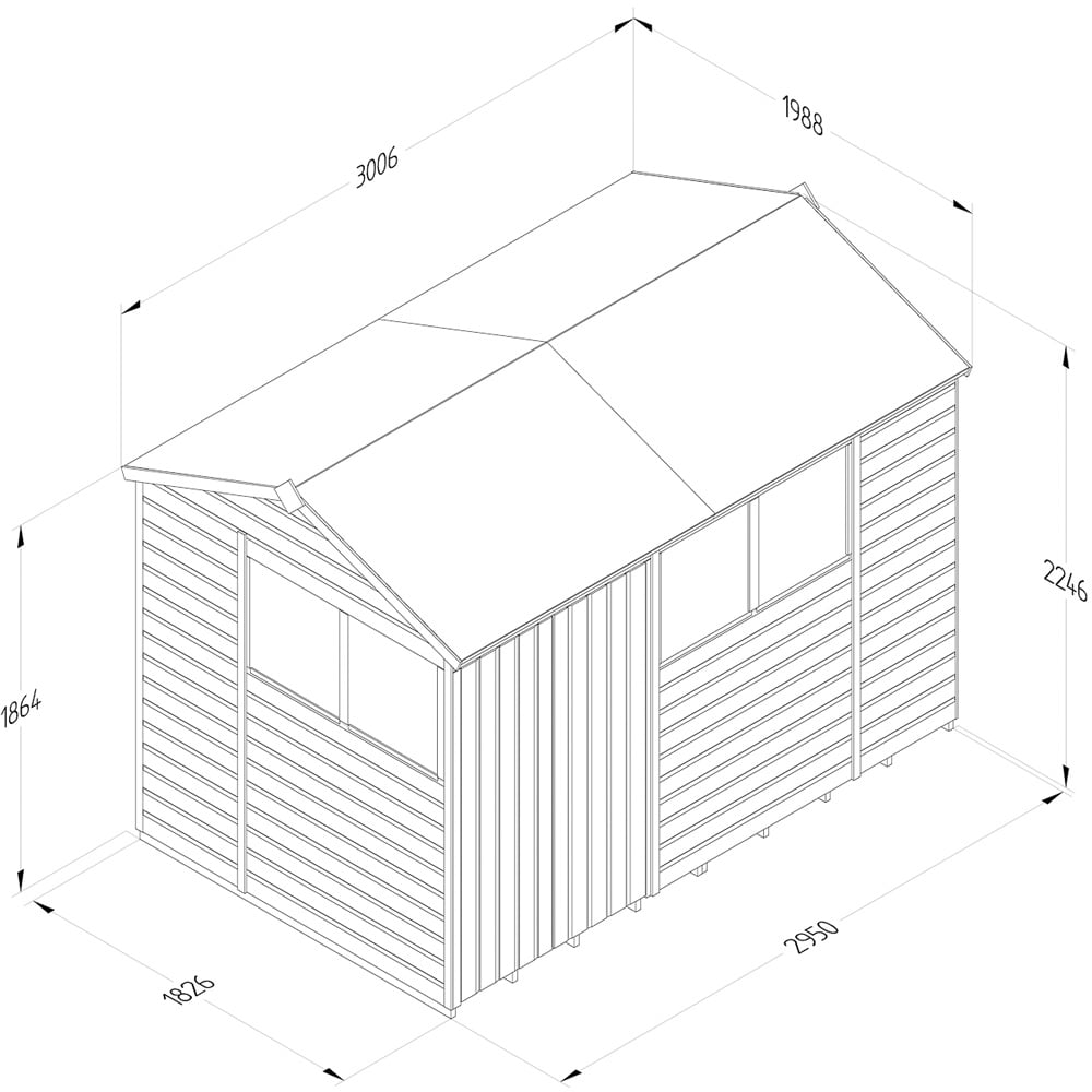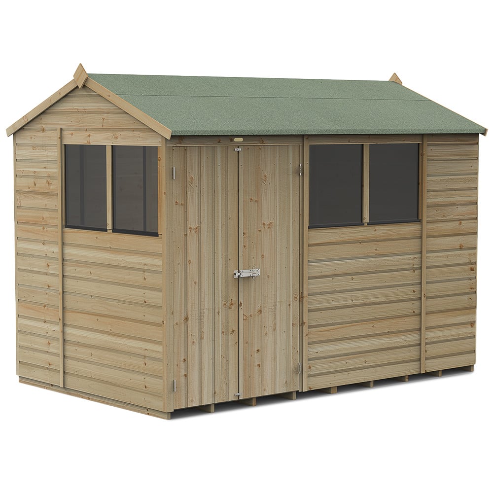Create a safe storage space for your gardening tools Forest Garden Beckwood 10 x 6ft Double Door 4 Windows Shiplap Reverse Apex Shed. This shed is proudly designed and manufactured in Britain, ensuring its durability and quality. It is specifically built to withstand various weather conditions, making it a perfect choice for storing gardening tools, bicycles, fishing equipment, or outdoor gear. It is constructed using robust and interlocking pressure-treated shiplap cladding, ensuring a watertight seal. With 30 percent thicker framing compared to most wooden sheds, this shed is built to last. The pressure treatment applied to the wood provides a 25-year anti-rot guarantee, eliminating the need for annual preservative treatment. Furthermore, this shed features an extra-thick interlocking tongue and groove floor, making it suitable for storing heavier items. The roof is made from hardwearing 8mm solid sheet material, providing durability and protection. Security is a top priority with this shed. The door features a double-Z frame, offering strength and preventing door movement. Hidden hinges and a heavy-duty traditional pad bolt further enhance security, ensuring that your valuable items are safe (padlock not included). Additionally, the door can be fitted with a left or right-hand opening, giving you the flexibility to choose. With its reverse apex roof, this wooden shed will complement any garden beautifully. It comes with a full set of fixings and clear instructions to assist you in achieving a hassle-free assembly process. Note: It is delivered free to most UK addresses through Forest Garden's white glove delivery service, with drop-off in your desired garden location and packaging removal included. Please Note: Orders to the following postal codes may be subject to longer leads than advertised: