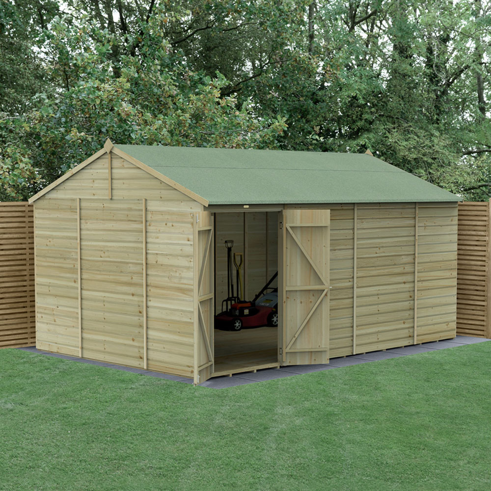Create a safe storage space for your gardening tools Forest Garden Beckwood 15 x 10ft Double Door Shiplap Reverse Apex Shed. This shed is proudly designed and manufactured in Britain, ensuring its durability and quality. It is specifically built to withstand various weather conditions, making it a perfect choice for storing gardening tools, bicycles, fishing equipment, or outdoor gear. It is constructed using robust and interlocking pressure-treated shiplap cladding, ensuring a watertight seal. With 30 percent thicker framing compared to most wooden sheds, this shed is built to last. The pressure treatment applied to the wood provides a 25-year anti-rot guarantee, eliminating the need for annual preservative treatment. Furthermore, this shed features an extra-thick interlocking tongue and groove floor, making it suitable for storing heavier items. The roof is made from hardwearing 8mm solid sheet material, providing durability and protection. Security is a top priority with this shed. The door features a double-Z frame, offering strength and preventing door movement. Hidden hinges and a heavy-duty traditional pad bolt further enhance security, ensuring that your valuable items are safe (padlock not included). Additionally, the door can be fitted with a left or right-hand opening, giving you the flexibility to choose. With its reverse apex roof, this wooden shed will complement any garden beautifully. It comes with a full set of fixings and clear instructions to assist you in achieving a hassle-free assembly process. Note: It is delivered free to most UK addresses through Forest Garden's white glove delivery service, with drop-off in your desired garden location and packaging removal included. Please Note: Orders to the following postal codes may be subject to longer leads than advertised: