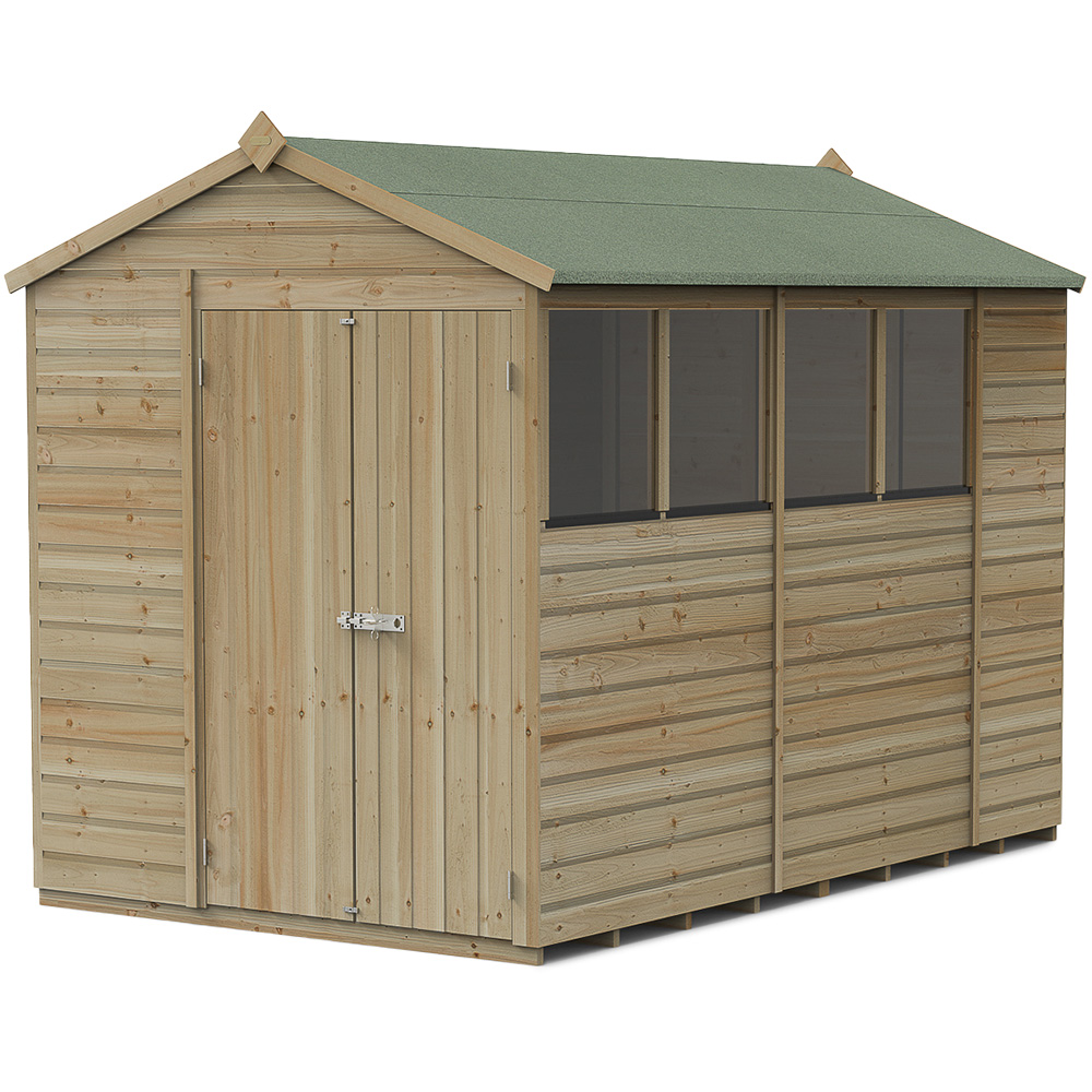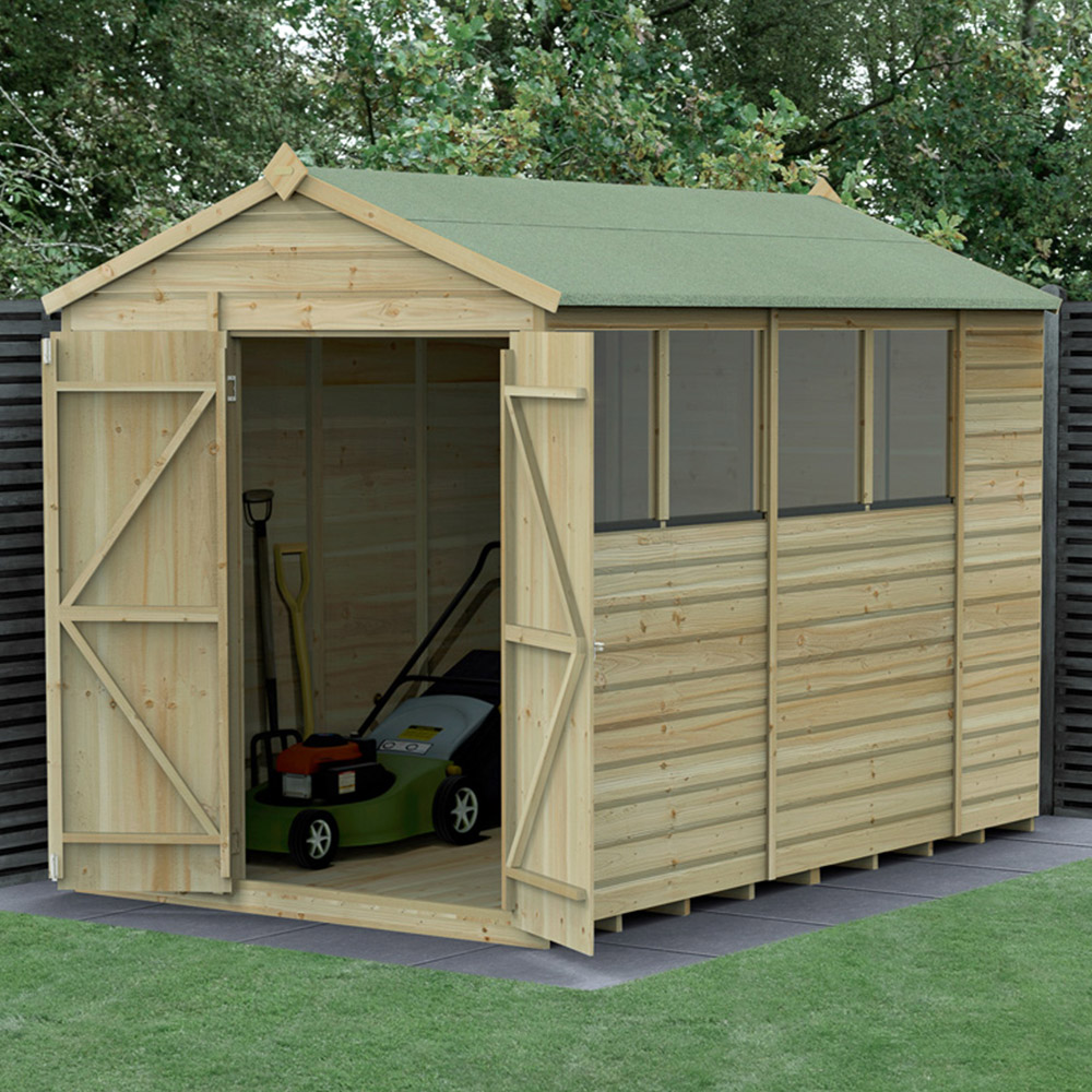 Create a safe storage space for your gardening tools Forest Garden Beckwood 6 x 10ft Double Door 4 Windows Shiplap Apex Shed. This shed is proudly designed and manufactured in Britain, ensuring its durability and quality. It is specifically built to withstand various weather conditions, making it a perfect choice for storing gardening tools, bicycles, fishing equipment, or outdoor gear. It is constructed using robust and interlocking pressure-treated shiplap cladding, ensuring a watertight seal. With 30 percent thicker framing compared to most wooden sheds, this shed is built to last. The pressure treatment applied to the wood provides a 25-year anti-rot guarantee, eliminating the need for annual preservative treatment. Furthermore, this shed features an extra-thick interlocking tongue and groove floor, making it suitable for storing heavier items. The roof is made from hardwearing 8mm solid sheet material, providing durability and protection. Security is a top priority with this shed. The door features a double-Z frame, offering strength and preventing door movement. Hidden hinges and a heavy-duty traditional pad bolt further enhance security, ensuring that your valuable items are safe (padlock not included). Additionally, the door can be fitted with a left or right-hand opening, giving you the flexibility to choose. With its traditional apex roof, this wooden shed will complement any garden beautifully. It comes with a full set of fixings and clear instructions to assist you in achieving a hassle-free assembly process. Note: It is delivered free to most UK addresses through Forest Garden's white glove delivery service, with drop-off in your desired garden location and packaging removal included. Please Note: Orders to the following postal codes may be subject to longer leads than advertised: