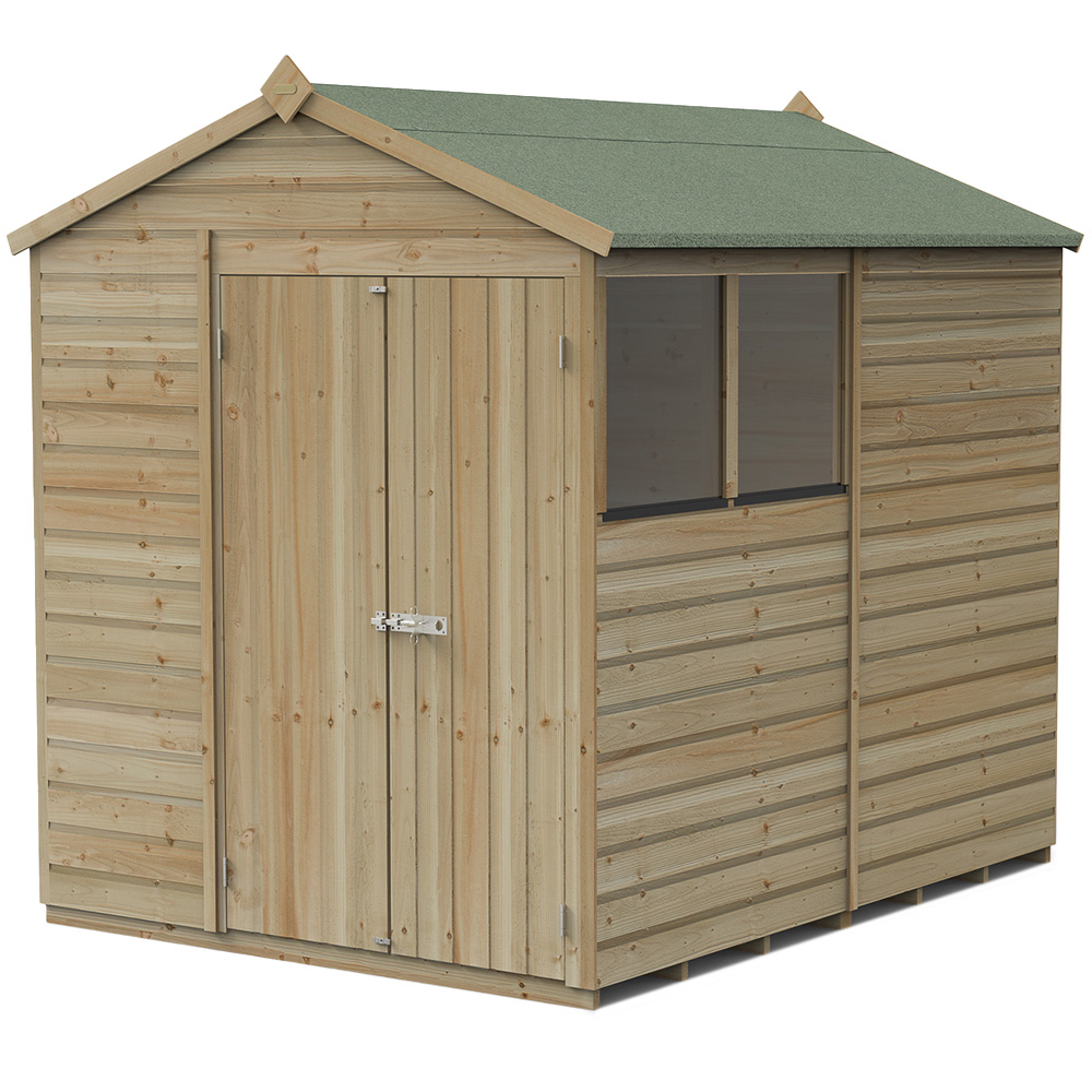 Create a safe storage space for your gardening tools Forest Garden Beckwood 6 x 8ft Double Door 2 Windows Shiplap Apex Shed. This shed is proudly designed and manufactured in Britain, ensuring its durability and quality. It is specifically built to withstand various weather conditions, making it a perfect choice for storing gardening tools, bicycles, fishing equipment, or outdoor gear. It is constructed using robust and interlocking pressure-treated shiplap cladding, ensuring a watertight seal. With 30 percent thicker framing compared to most wooden sheds, this shed is built to last. The pressure treatment applied to the wood provides a 25-year anti-rot guarantee, eliminating the need for annual preservative treatment. Furthermore, this shed features an extra-thick interlocking tongue and groove floor, making it suitable for storing heavier items. The roof is made from hardwearing 8mm solid sheet material, providing durability and protection. Security is a top priority with this shed. The door features a double-Z frame, offering strength and preventing door movement. Hidden hinges and a heavy-duty traditional pad bolt further enhance security, ensuring that your valuable items are safe (padlock not included). Additionally, the door can be fitted with a left or right-hand opening, giving you the flexibility to choose. With its traditional apex roof, this wooden shed will complement any garden beautifully. It comes with a full set of fixings and clear instructions to assist you in achieving a hassle-free assembly process. Note: It is delivered free to most UK addresses through Forest Garden's white glove delivery service, with drop-off in your desired garden location and packaging removal included. Please Note: Orders to the following postal codes may be subject to longer leads than advertised: