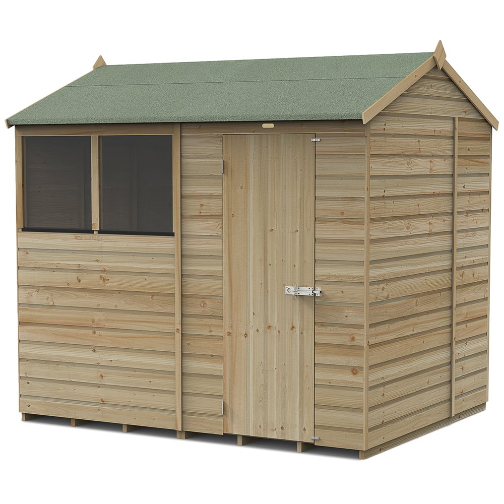 Create a safe storage space for your gardening tools Forest Garden Beckwood 8 x 6ft Single Door 2 Windows Shiplap Reverse Apex Shed. This shed is proudly designed and manufactured in Britain, ensuring its durability and quality. It is specifically built to withstand various weather conditions, making it a perfect choice for storing gardening tools, bicycles, fishing equipment, or outdoor gear. It is constructed using robust and interlocking pressure-treated shiplap cladding, ensuring a watertight seal. With 30 percent thicker framing compared to most wooden sheds, this shed is built to last. The pressure treatment applied to the wood provides a 25-year anti-rot guarantee, eliminating the need for annual preservative treatment. Furthermore, this shed features an extra-thick interlocking tongue and groove floor, making it suitable for storing heavier items. The roof is made from hardwearing 8mm solid sheet material, providing durability and protection. Security is a top priority with this shed. The door features a double-Z frame, offering strength and preventing door movement. Hidden hinges and a heavy-duty traditional pad bolt further enhance security, ensuring that your valuable items are safe (padlock not included). Additionally, the door can be fitted with a left or right-hand opening, giving you the flexibility to choose. With its reverse apex roof, this wooden shed will complement any garden beautifully. It comes with a full set of fixings and clear instructions to assist you in achieving a hassle-free assembly process. Note: It is delivered free to most UK addresses through Forest Garden's white glove delivery service, with drop-off in your desired garden location and packaging removal included. Please Note: Orders to the following postal codes may be subject to longer leads than advertised:
