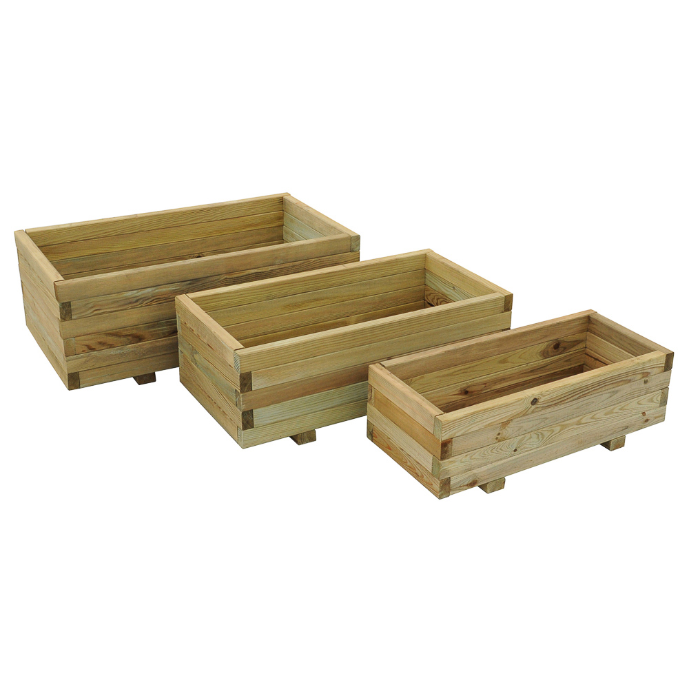 Brighten up a plain patio or empty decking area with this Forest Garden Durham Rectangular Planter Set. With a simple four-sided design, natural timber finish and horizontal lines, this planter makes a stylish addition to your outdoors. The set contains three planters of decreasing size and can hold multiple plants or flowers to add interest to garden areas. Manufactured from high-quality pressure-treated timber, this planter is sturdy and comes with a 15-year anti-rot guarantee. Easy to use, the planters come assembled so that you can start straight away. Please Note: If used to grow food products, its recommend lining the bed and planter with a membrane before adding the soil. Size: Small - 23 x 72 x 32cm, medium - 28 x 81 x 41cm and large - 33 x 90 x 50cm. Please Note: Orders to the following postal codes may be subject to longer leads than advertised: