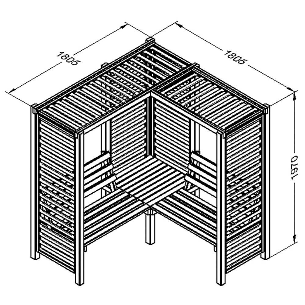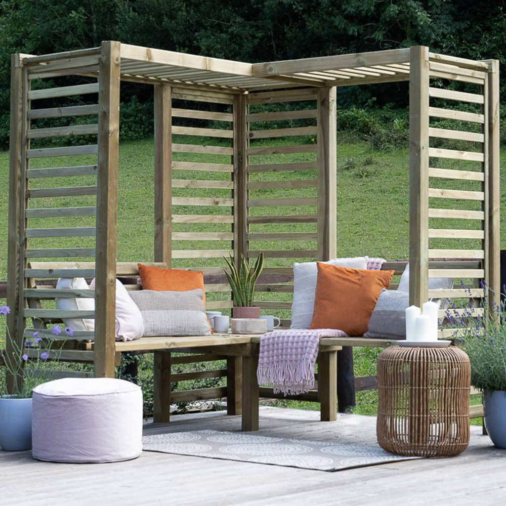 Make a contemporary addition to your garden with the Forest Garden Firenze 4 Seater 6.4 x 5.9 x 5.9ft Corner Arbour. It combines slats and benches to create a stunning garden structure. The right-angled, corner design allows two benches on the arbour, compared to traditional arbours. With modern straight lines, it will turn any garden corner into a perfect haven to sit, relax and unwind with friends. The slatted roof can also house climbing plants to create a shaded area during the sunnier months and add a touch of elegance to the arbour. This arbour is manufactured using pressure-treated timber, which gives it a 15-year guarantee against rot and fungal decay. Able to seat four people comfortably, the arbour is one of the largest in the Forest range, making it perfect for al fresco entertaining. Delivered to you flat-packed with fixings and instructions for a quick and easy build. Protect your garden furniture with our durable and waterproof covers. Explore our wide range of heavy-duty
