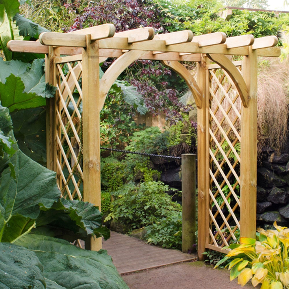 The impressive Large Ultima Pergola Arch from Forest will create a stunning garden entrance or walk way. Contemporary straight lines are complimented by classic arched supports and lattice panels. The size of the arch makes it perfect for larger gardens and when covered with climbing plants it will become a real feature in your garden.