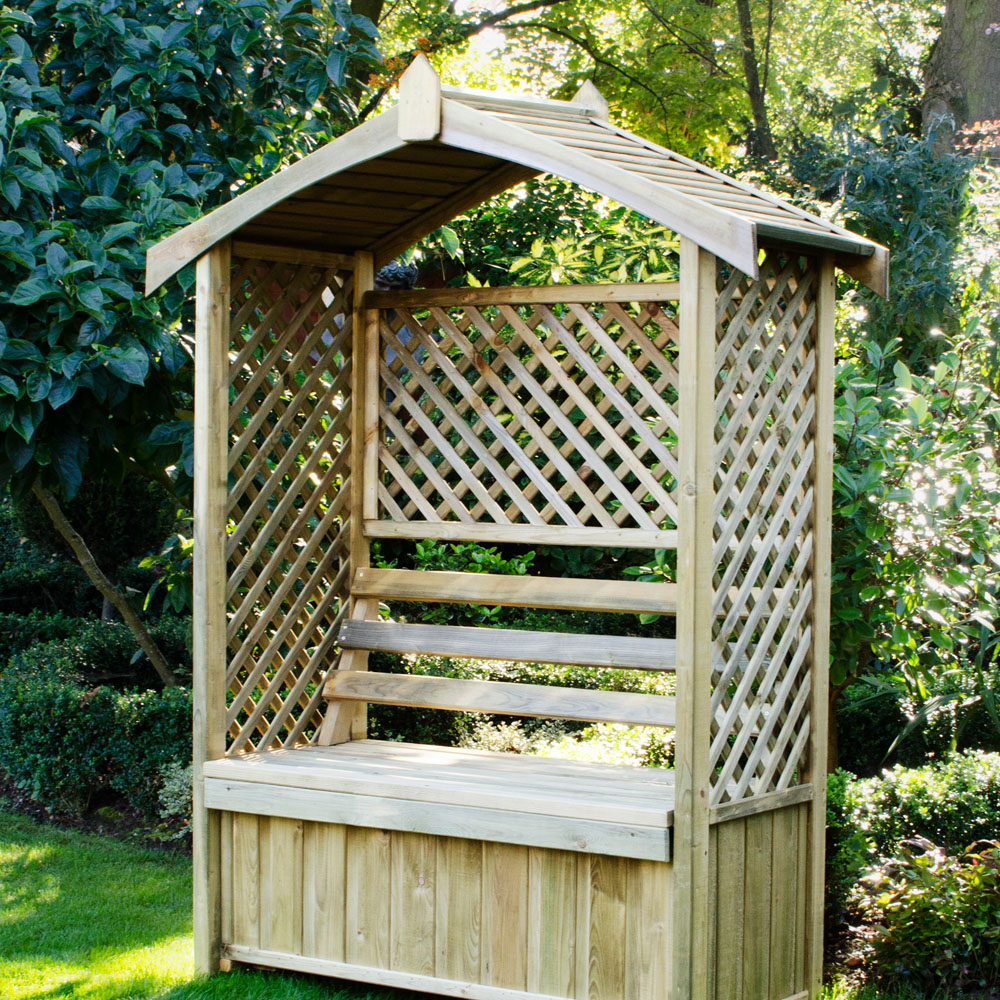 The beautiful Lyon Arbour combines three lattice panels that are perfect for climbing plants and a seat that can comfortably fit two people. Create a little sanctuary to enjoy your garden from and enjoy the scent of summer flowers. The arbour is manufactured from Pressure Treated timber to give it a 15 year guarantee against rot and fungal decay and has been smooth-planned for a splinter free finish. The solid timber roof offers shelter from unexpected rain showers and the sun. Delivered flat packed for easy self-assembly. Fixings and instructions are all included. Please Note: Orders to the following postal codes may be subject to longer leads than advertised: