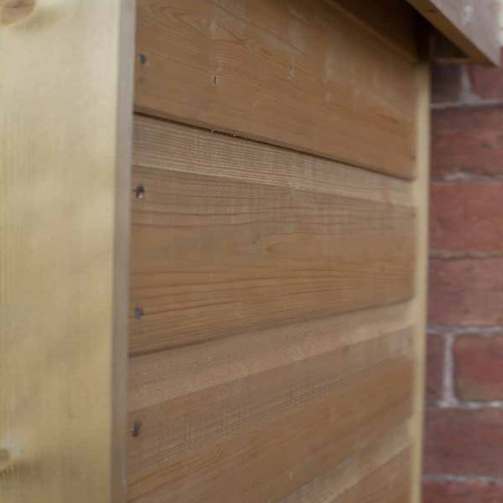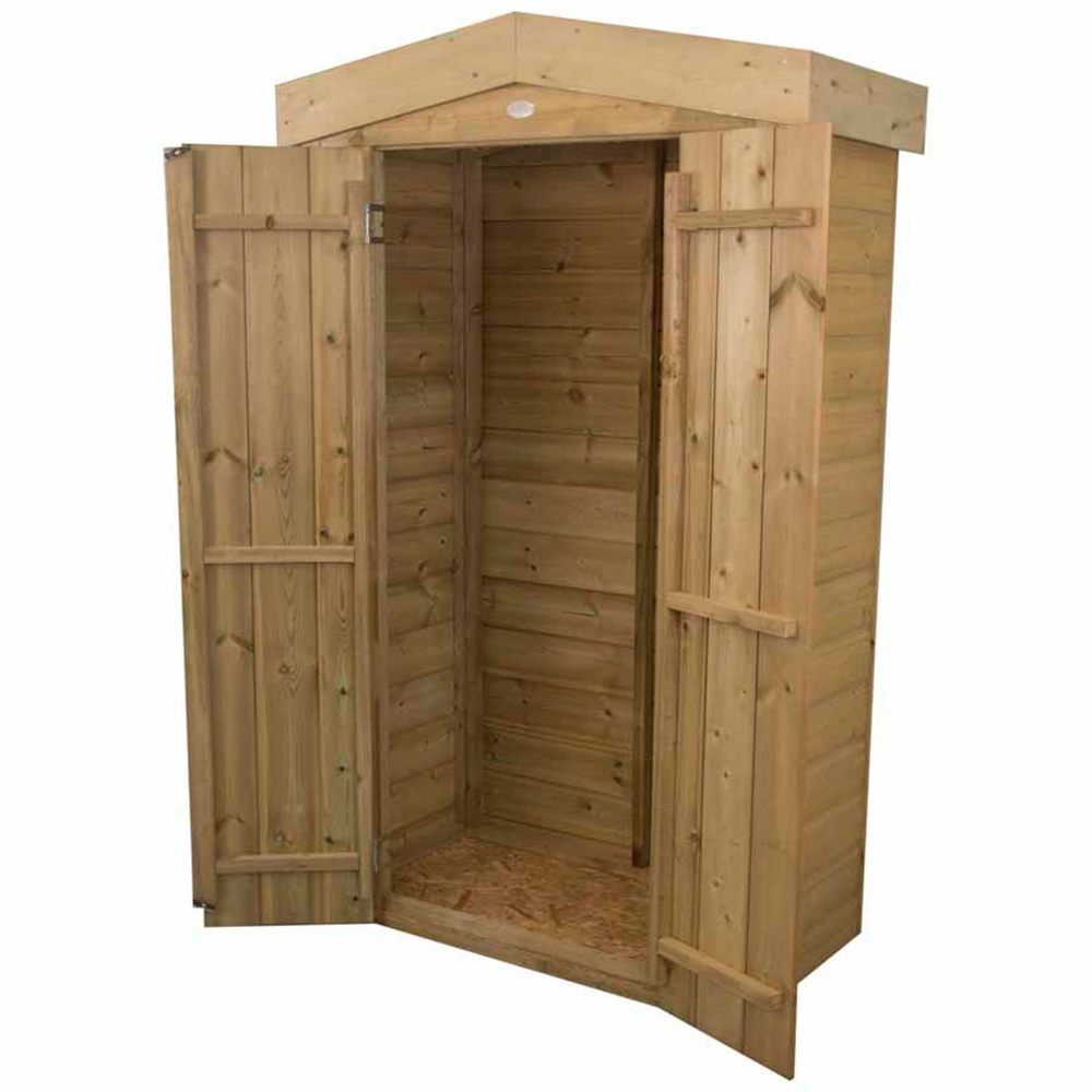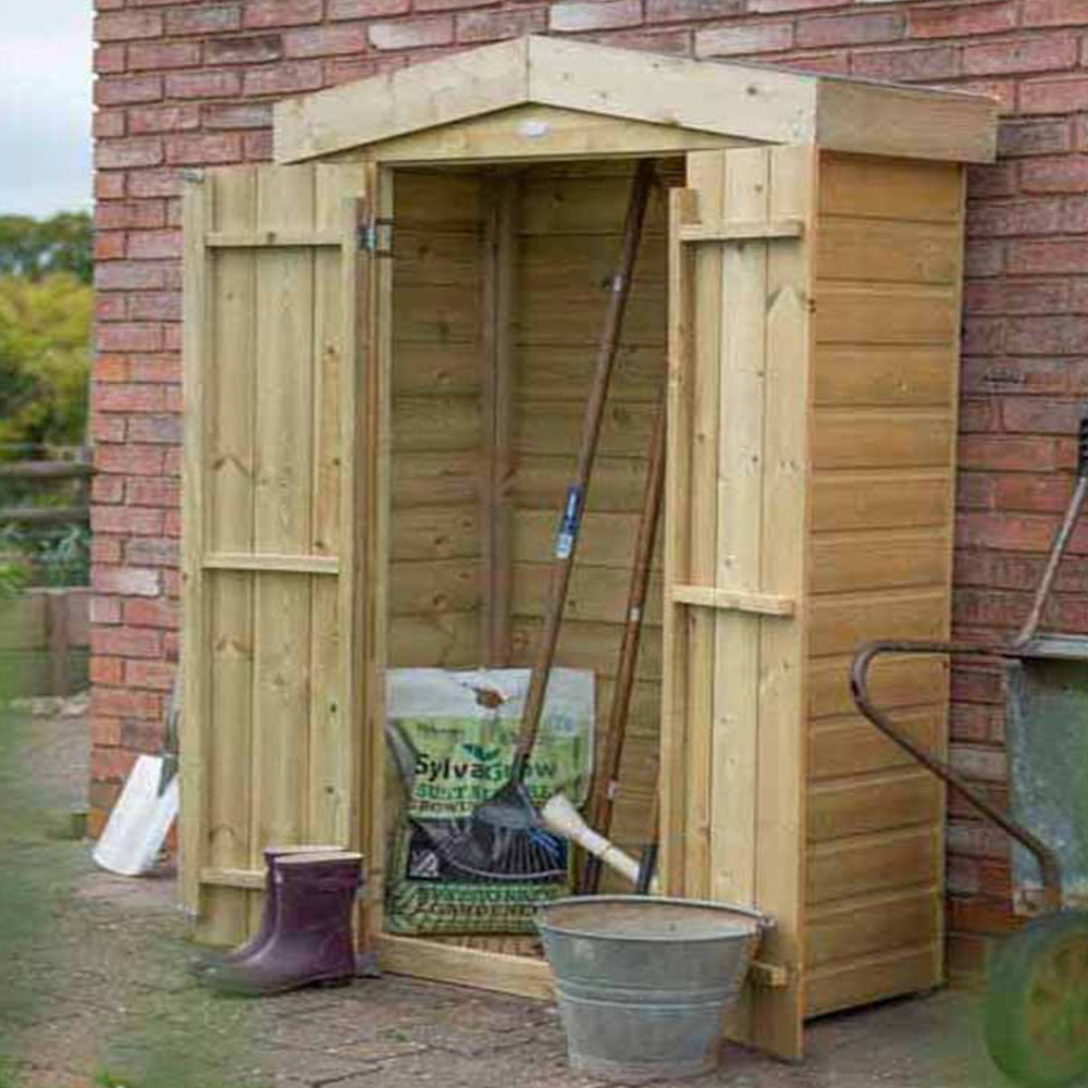 The stylish Shiplap Tall Garden Store from Forest has a 750 litre capacity which makes it ideal for storing a wide range of outdoor equipment. With a roof height of just under six foot it is perfect for storing long handled gardening tools, barbeques or folding furniture. A relatively small footprint means it is perfect for positioning against a wall or fence and with its natural colour finish, it will blend attractively into any garden.The Garden Store is made from a robust Shiplap Tongue & Groove Pressure Treated construction and the front is finished with smooth-planed decorative barge boards. The high quality green mineral felted Apex roof keeps the store weathertight and the floor is mounted on Pressure Treated bearers to keep it off the ground and dry. The double doors are finished with a plate hasp and staple latch that can be secured with a padlock.Also available with Pent roof.