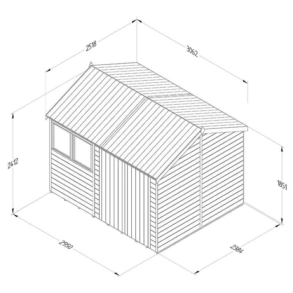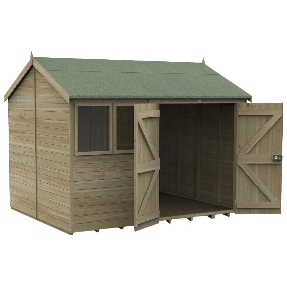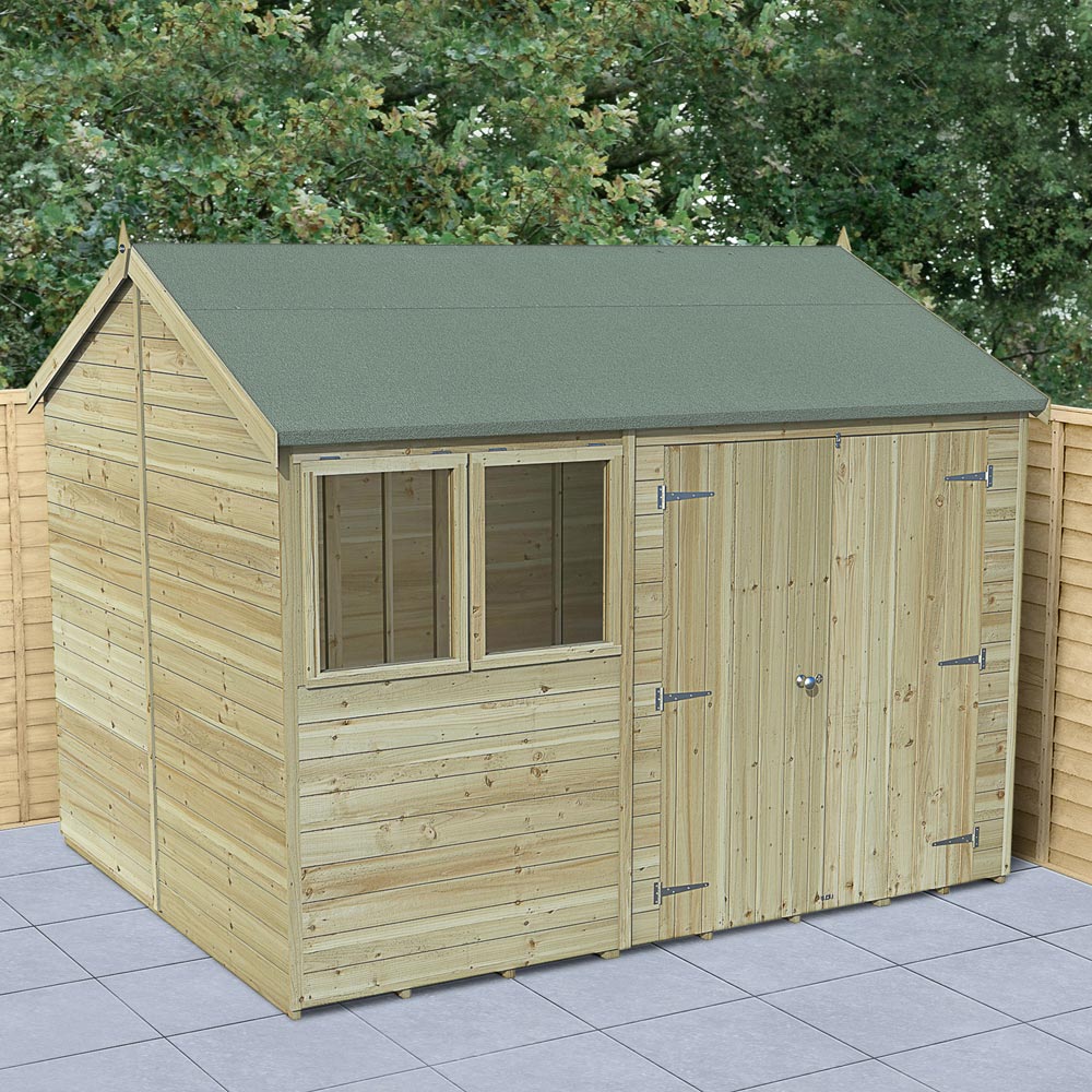 Keep your garden essentials and tools safe with Forest Garden compact 8 x 10ft Reverse Double Door Apex Workshop. This large 8 x 10ft reverse apex workshop is a premium quality building with great specifications. The dimensions of the shed make it ideal for use as a workshop. Having double doors, it has plenty of room for a workbench, chair, shelf, and space for storage of large site items. The shed walls are made using premium quality pressure-treated tongue and groove boards with supporting floor bearers. Please Note: Orders to the following postal codes may be subject to longer leads than advertised: