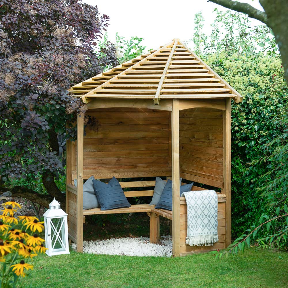 Get yourself the perfect space to escape and entertain with the Forest Garden Venetian 2 Seater 8.2 x 7.6 x 5.2ft Corner Arbour. The Venetian-style roof features a slatted design that lets light stream in and keeps any unexpected showers out. The timber used to manufacture this arbour has been slow-grown and pressure-treated to give it a 15-year guarantee against rot and fungal decay. The side and back are constructed from sturdy 12mm tongue and groove panels to give privacy and shade, while the front panels are open to allow light and air in and to give a great view of your garden. The design of this arbour seat makes it perfect for fitting into an unused corner without taking up too much room. Self-assembly is required but is made simple with the easy-to-follow instructions and fixings that are included. Protect your garden furniture with our durable and waterproof covers. Explore our wide range of heavy-duty