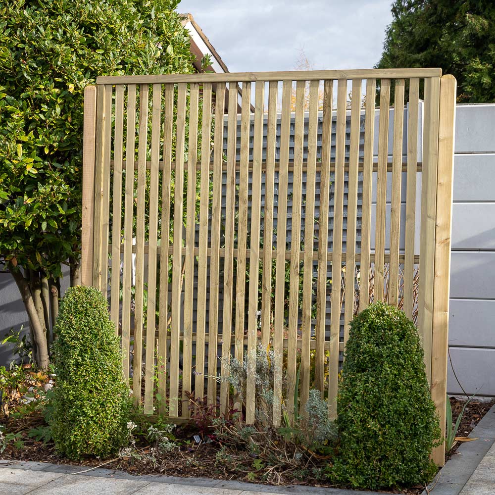 The Vertical Slatted Garden Screen from Forest Garden is ideal as a wall-mounted trellis, added to a planter, or for modern garden screening. The straight lines and robust framing make this a contemporary, strong trellis panel for training your plants. In combination with the other sizes available, it is ideal for dividing areas of your garden, such as framing an outdoor dining area. Pressure treated to ensure longevity, the trellis screen can be mounted vertically or horizontally for screening or as a garden feature suitable for climbing plants. Size: 1.8 x 1.8m. Please Note: Orders to the following postal codes may be subject to longer leads than advertised:
